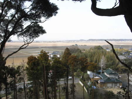 | 阿波崎城址から北方を望む。 奥にかすかに霞ヶ浦が見えます。 当時は眼下の水田地帯も水域であったと思われます。 |