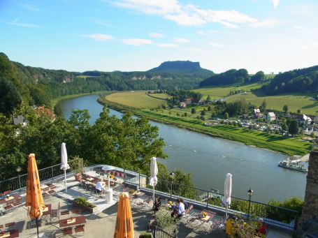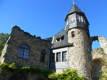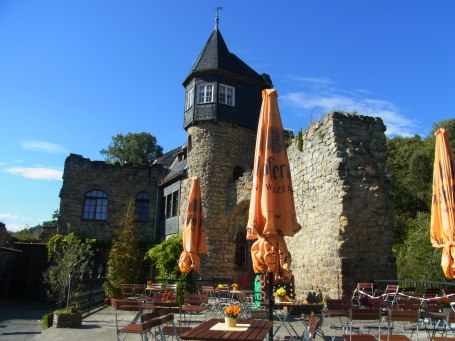 <沿革> 築城の経緯については詳らかでない。1261年のローマ教皇ウルバヌス4世の書簡に、 マイセン司教に従わない周辺領主の1人としてテオドリクス・ド・ラーテン(Teodoricus de Raten)の名があり、これが間接的にラーテンの城の存在を示す初出とされている。ただ、 このラーテンの城が、アルトラーテン城を指すのか、峰続きにあるノイラーテン山城を指す のかは不明である。 1361年の神聖ローマ皇帝カール4世の文書において、初めてラーテンの「2つの」城の 存在が記載され、両方ともがボヘミアの所有であることが確定された。1406年、ボヘミア 貴族のひとりヒンコー・ベルカ・フォン・ドゥーバが、城を購入した。1408年、ドーナ城伯と マイセン辺境伯が争った「ドーナの乱(Dohnaische Fehde)」の戦後処理を経て、ラーテン から南へ4㎞ほどのところにあるケーニヒシュタイン城がザクセン選帝侯の所有となると、 ラーテンはボヘミア領からみてザクセン領に突出した不安定な土地となった。ヒンコーの 死後、アルトラーテン城はヒンコーの3男ベネシュが継いだ。 1426年(28年とも)、ケーニヒシュタイン城代フリードリヒ・フォン・デア・エルスニッツが アルトラーテン城を制圧し、選帝侯から城主に任じられた。この後10年にわたってフリード リヒとベルカ・フォン・ドゥーバ家との争いが続き、1438年にベネシュの子アルブレヒトが 城を奪い返した。しかし、翌年には選帝侯の支援を受けたフリードリヒが再度城を奪った。 エルスニッツ家は改めて城主に任じられたが、次第に盗賊騎士化していった。1467年 には、選帝侯領を共同統治していたエルンストとアルブレヒト兄弟がハンス・フォン・デア・ エルスニッツ討伐のため兵を送って城を囲んだ。包囲は1年に及び、ハンスは城を棄てて 落ち延びた。1469年には破城が行われた。 1888年、ドレスデンの実業家エドゥアルト・ザイフェルトが廃墟となっていた城を購入し、 1893年にかけてネオゴシック様式で再建した。第二次世界大戦後は、ドイツ民主共和国 (DDR)の研修施設として利用された。1990年のドイツ再統一後は個人所有となり、2001 年にゾンマー家が購入した後、ホテルに改装され現在に至っている。 <手記> アルトラーテン城は、エルベ川とその支脈アムゼルグルントバッハ川の合流点に延びた 尾根の先端に築かれています。尾根伝いに500mほど登ると、ノイラーテン山城跡があり ます。アルトラーテンを直訳すると「古ラーテン」、ノイラーテンは「新ラーテン」となります。 額面通り受け止めれば、こちらの方が先に築かれたとみるべきなのでしょうが、石造の アルトラーテン城よりも木造だったと推測されているノイラーテン山城の方が、直感的には 様式が古いように感じられます。いずれにせよ、文献上も「ラーテン」の城がどちらを指して いるのかは判別不能のようです。 現在はホテルやカフェ・レストランとして営業しています。このホテルの特徴は、主塔の 最上階も客室になっているという点です。主塔はそもそも住むための施設ではないので、 いくら古城ホテルといえどもわざわざ主塔を客室に改装しているところはほとんどないよう に思います。したがって、お殿様も味わったことのない主塔での一夜を楽しめるという点 では、貴重かもしれません(笑)。ちなみに、この最上階の部屋でも一泊120ユーロ程度 なので価格もお手頃です。 カフェ・レストランのみの客でも主塔の途中までは登らせてもらえます。ラーテンは保養 の町として売り込んでいて、眼下にはエルベ川沿いののどかな景色が広がります。 |