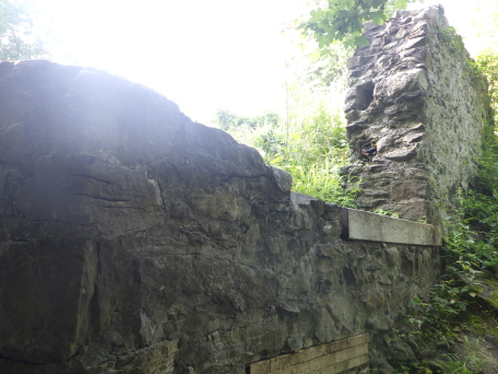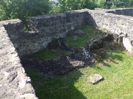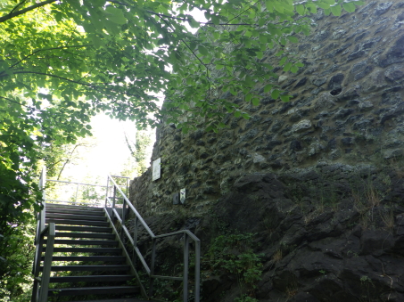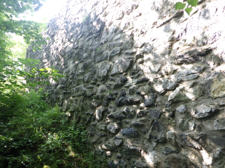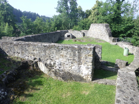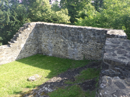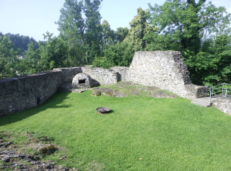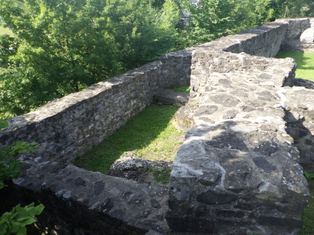 <沿革> 1250年ごろに、シェレンベルク家によって築かれたと考えられている。シェレンベルク家は オーストリア辺境伯レオポルト3世の五男オットー・フォン・フライジングの家臣として初めて 記録に登場し、12世紀にノイシェレンベルク城を築いて居城としていた。1317年、シェレン ベルク家がこれら2城を含めたエシュナーベルクの所有財をヴェルデンベルク=ハイリゲン ベルク伯に売却し、マイヤー・フォン・アルトシュテッテンが領主ないし代官に据えられたと するのが、史料上の初出である。 1350年には主塔が設けられ、1380年には城壁や城門が増築された。1394年には、当時 の城主であるヴェルデンベルク=ハイリゲンベルク=ブルーデンツ伯アルブレヒト3世が2城を いかなる時でもオーストリア公に開放するよう命じている。 1412年、アルブレヒト3世は娘婿のヴィルヘルム・フォン・モーントフォルト=テットナングに 城を売却した。1437年までには、2城の所有権を含むシェレンベルクの支配権がブランディス 男爵家の手に帰し、1507年にズルツ伯へと渡った。 1613年、ホーエネムス伯がファドゥーツおよびシェレンベルクを購入し、1646年に同家は ホーエネムス=ルステナウ家とホーエネムス=ファドゥーツ家に分かれた。シェレンベルクは 後者に属していたが、17世紀後半にホーエネムス=ファドゥーツ伯フェルディナント・カールが 過度な魔女狩りを行ったため、弟ヤーコプの告発により皇帝の命で捕縛された。フェルディ ナント・カールは刑死者の財産を収奪して私腹を肥やしていたが、1684年に位を廃された 上で不当に得た財産の返還を命じられた。家督はヤーコプが継いだものの、返還の履行が 困難となり、1699年にシェレンベルク領をリヒテンシュタイン侯ヨハン・アダム1世に売却した。 すでにアルトシェレンベルク城はほとんど廃墟と化していたようだが、リヒテンシュタイン侯が シェレンベルクやファドゥーツ(1714年に購入)を欲したのはこの2伯位が帝国議会の議席権 を有する帝国等族であったからであり、所領や城館には関心をもってはおらず、顧みられる ことはなかった。 19世紀に入ると、城跡の石材は地元の教会建設などに用いられた。1956年、リヒテンシュ タイン公フランツ・ヨーゼフ2世は城跡をリヒテンシュタイン公国歴史協会に寄贈した。 <手記> シェレンベルクはミニ国家リヒテンシュタイン公国の北端近くに位置する地域で、800mほど 離れてアルトシェレンベルク城とノイシェレンベルク城があります。アルトとはオールド、ノイは ニューの意ですが、築城順は逆でアルトシェレンベルク城の方が新しく築かれたようです。 他方で現存する遺構は明らかにノイの方が規模が大きく、アルトは小城なうえ林に埋もれて ほとんど目につきません。こうした現況の差によって、新城と古城が取り違えられる逆転現象 が起こったのかなと推測されます。 北西辺はエシュナーベルクの急斜面となっているようですが、他の三方は城外との高低差 があまりなく、要害性は高いとはいえません。堀切を挟んで主郭と副郭(Vorburg)に分かれて おり、副郭の遺構は限定的です。他方で主郭は建物の基部がよく残っているほか、珍しい 点として石竈が剥き出しで復元されています。その脇の城壁には排出口が開いており、時代 を鑑みると排泄物なども捨てていたのではないかと推測され、竈の近くにそんな穴があると いうのは不思議の感があります。 北東端には宮殿と主塔が一緒になったメインの建物があったようで、修復がなされている のでしょうが、この部分の石壁が最もしっかりしているように見えます。とはいえやはり規模は 小さく、シェレンベルク家にとってもその後の所有者にとっても、あくまでノイシェレンベルク城 に対するサブの役割に留まっていたのでしょう。 |