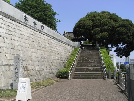 | 本覚寺山門を望む。 階段上の大木の脇にアメリカ領事館跡の碑があります。 |