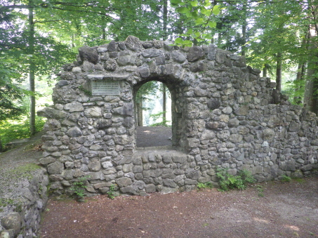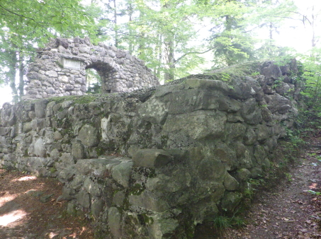 <沿革> 1229年の文書にベルネック家の存在が記されていることから、このころに築かれたと推測 されている。ベルネック家はザンクト・ガレン修道院やラッパースヴィル伯家に仕えていたと みられ、また北のランデンベルク家とも密接な関係にあったと考えられている。 城には小さな所領しか付属しておらず、ベルネック家は常に窮乏していたようで、1277年 には領地の大部分が聖ヨハネ騎士団ブービコン管区に売り払われ、1283年には城自体も 売却された。その際の契約において、城は3週間以内に取り壊されることが規定されていた。 現地からこれといった遺物が見つかっていないことから、建物から調度品に至るまで、破城 は暴力的ではなく計画的に遂行されたと推定されている。 ベルネック家に残されたのは、城下のささやかな農場だけであった。最後の城主となった ベルタとハインリヒの息子が経営を続けたとみられているが、1318年以降は消息が途絶え、 ベルネック家は滅びたか名を変えて移住したと推測されている。 その後、誰にも顧みられることもなかった城跡は、1900年時点で痕跡も確認できない状態 となっていた。1923年に発掘が行われたものの、考古学的見地に基づく調査ではなかった。 1935年と1939年には修復が試みられ、城跡の石材で城壁の一部が再建された。また城門も 建てられたが、模擬であり史料等に基づくものではない。最も直近の修復は、1974年に実施 されている。 <手記> 現地レポートへと入る前に、調べていて書いていて、弱小領主の悲哀と労苦を詰め込んだ ようなベルネック家の短い歴史に涙が出そうになりました。と同時に、城や所領の売買という 事例のほとんどない日本との違いはどこから生じているのかな、とも気になりました。 ベルネック城へは、ラッパースヴィル近郊に住む友人を訪ねた際に、懇願して車で連れて 行ってもらいました。案の定、「こんなところに城跡があるなんて知らなかったよ!」と、日本 でもおなじみの反応も頂戴しました笑 車であれば、城峰の付け根側に無料の駐車場があります。そこからは林の中のハイキング コースを進みますが、その入り口のベンチで日向ぼっこをしていたおばあちゃんとお話をした ところ、やはり「え~、お城跡なんて知らないわよ」と日本でも聞きなれたフレーズを耳にしま した。たしかにコースからは外れて丘を登らなければならないので、散策をしているだけでは 気付けないかもしれません。 城跡には再建された城壁や件の模擬門がありますが、どうも補修材にコンクリートが使用 されているように見えます。事実とすれば残念ですが、時代を鑑みれば致し方ありません。 おそらく、模擬門のある城壁を境に東側が居住棟、西側がブルクホーフ(城庭)だったものと 推察されますが、どちらも面積は小さく、城というより家屋といった規模感です。 曲輪の東側には堀切が設けられていますが、ほとんど埋まっているのかかなり浅く、その 外側にももう1本堀切があるというものの、どちらかというと自然の鞍部のような感じです。 西側にも堀切があったそうですが、友人夫婦と一緒なのであまりはしゃぎすぎるわけにも いきませんでした。 |