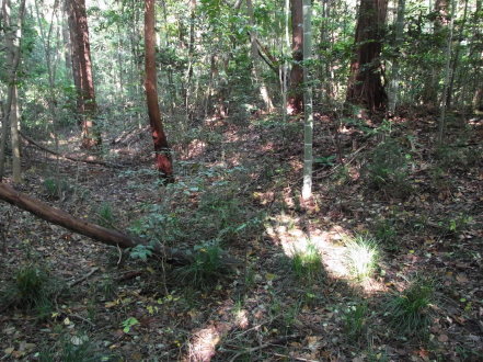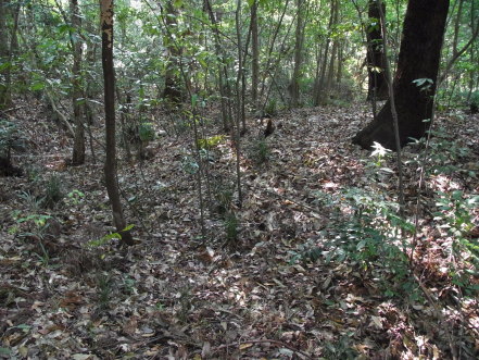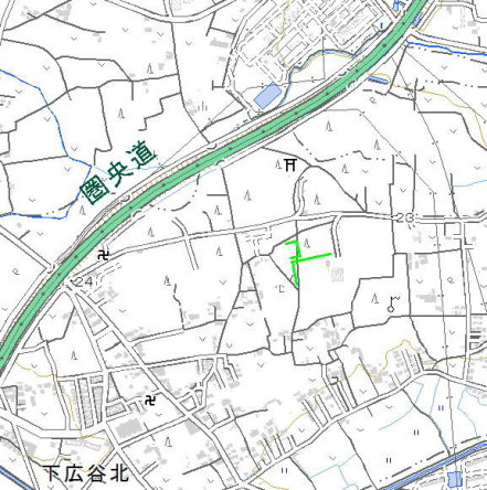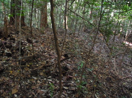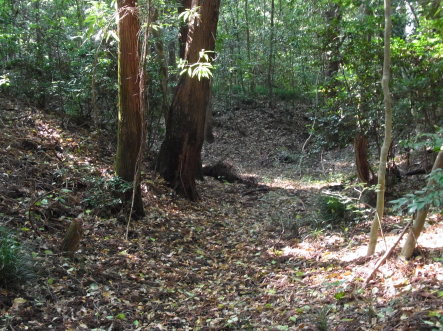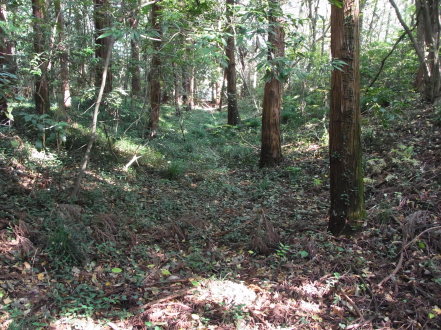<沿革> 『新編武蔵国風土記稿』の下広谷村の項に「古跡三ケ所」とある内の1つと推定 されている。 隣接する大堀山館と同時期に築かれたものと考えられているが、他の史料には みられず、詳細は不明である。 <手記> 大堀山館のすぐ東にありますが、藪の中なのでなかなか行き方がわかりづらい 城跡です。私が歩いて見た限りでは、上の図のような遺構が認められたのですが、 これは『日本城郭大系』所収の縄張り図とまったく合っていません。『大系』の図は 大堀山館についても疑問があるので、あまり当てにしない方が良いのではないか と思われます。 道についても、上の地図に記載されているようなはっきりしたものはありません。 大堀山館北辺へと続く細い道路の途中に最終処分業者の出入り口があり、その 真向いに、館跡へ北から入る踏み分け道があります。 某館(2)は少なくとも南北2つの曲輪に分けられるようです。仮に北郭および南郭 と呼ぶとすると、南郭がおそらく主郭となります。北から入って最初に見える遺構は 北郭東辺の堀と土塁です。さらに南下すると、南郭の大きな空堀と土塁が見えて きます。結構な規模があり、これを見ると、ようやく城館跡に来たという実感が湧き ます(笑)。北郭は南郭の出郭と思われますが、それでも四周を堀で囲まれていた ようで、南郭との境では二重堀となっています。 もう1つ館跡へ向かうルートがあり、大堀山館東の墓苑の南東隅からやはり獣道 を分け入り、途中で左に折れた先に、おそらく南郭の西辺のものと思われる堀と 土塁が見られます。その他の部分は、残念ながら藪が深くて踏査は断念しました。 最初は、『中世城館調査報告書集成』の地図にしたがってあたりをつけたところ が現在グラウンドとなっていたため、これは消滅しているのかもと半ば諦めながら、 グラウンドの東側から南側裏手へ回り、藪へと突入しました。蜘蛛の巣に苛められ ながら西へ西へと進むと、上の図の西辺の土塁を発見し、感動とともに安堵するに 至りました。 某館(2)が、その他の大堀山館周辺の城館跡と同じく、城郭群として同じ時期に 築かれたのであろうことは、『大系』にもある通り想像に難くありません。 |