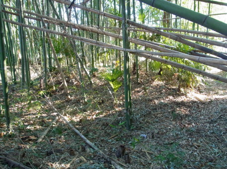 <沿革> 『甲斐国志』などでは、堀田筑前の邸跡としている。ただし、堀田筑前なる人物について 詳細は不明である。 他方、筑前原の南には国分寺や国分尼寺跡があることから、筑前原塁を国府に関する 施設跡とする向きもある(『甲州風土記』など)。こちらも確証はなく、推測の域を出ない。 ちなみに、「堀田筑前」の通称をもつ人物としては、江戸時代前期の大老堀田筑前守 正俊が挙げられる。堀田氏は正俊の父正盛の代に甲斐国内にも所領を得たとされるが、 筑前原との関連があるかは不明である。 <手記> 筑前原塁は、諸資料によれば広さ五町ほどもある大きな塁跡だったようです。ですが、 今日では一宮西小学校と泉正寺の間の竹林に、わずかに土塁の断片を残すばかりです。 この土塁は、近年まで西の甲斐奈神社まで続いていたようですが、今は住宅地になって います。 したがって、現在の遺構から全体像を推し測るのは困難ですが、比較的良好に残って いた頃の土塁ラインからみても、筑前原塁の用途については謎に包まれています。直感 としては、敷地の広さや不規則な土塁配置を鑑みると、誰かの屋敷跡とするのは難しい ように思います。また、国府に関する遺構とするのも、全国に少なからず存在する国府跡 から同様の遺構が見つかっていない以上、早計といわざるを得ません。 個人的には、筑前原塁の東の都塚一帯で行われたとされる「ミヤケ塚」の戦いとの関連 を考えています。永正十七年(1521)に武田信虎と栗原信友ら反信虎勢力との間で勃発 したこの戦いで、筑前原にはどちらかの陣営によって大規模な陣城が設けられたのでは ないかと、直感的に推測しています。陣城であるとすれば、面積が広いことも、縄張りに あまり脈絡がないことも、また土塁のみで堀が設けられていないことも、説明がつくように 思います。 |