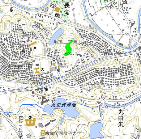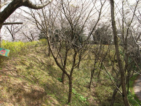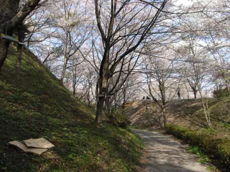 <沿革> いつごろ誰によって築かれたか全く不明である。『吾妻鏡』にみられる、奥州藤原氏が 築いた「国府中山上物見岡」の陣所を長命館の地に比定する説もあるが、現在では有力 ではない。藤原秀衡の庶長子国衡の砦があったともいわれるが確証はない。 戦国時代には長命氏が在城したといわれる。16世紀初頭の留守氏関連文書の中に、 「国分勇者長命別当」という人物の名がみられ、国分氏の一族か家臣であり、長命館の 城主であったものと推測されている。 <手記> 長命館は、七北田川南岸の河岸段丘の先端に築かれています。歴史的には全く無名 の城ですが、遺構が良好に残っていることと、発掘調査を伴った公園整備によって、非常 に見ごたえのある城跡となっています。松森城や岩切城と同じく桜の公園となっていて、 ちょうど訪れたときに季節遅れの満開だったので、下の写真も訪城の記録というより普通 のお花見のようになっています。 長命館は、大きく分けて4つの曲輪から成っていて、それぞれの曲輪は深い堀によって 隔てられています。また、曲輪の周囲には虎口や堀、小規模な帯曲輪などが取り巻いて います。長命氏は国分氏の一族か家臣とみられていますが、国分氏の居城である松森 城よりも、かなり技巧的で規模の大きな城であるように感じました。 東南部が一部公園化によって削られてしまっていますが、概ね城の遺構が十全に保存 されています。広い曲輪では子供が走り回り、大人は花見に興じ、物見岡では高校生が のどかにだべっていて、理想的な市民の憩いの公園となっています。 |