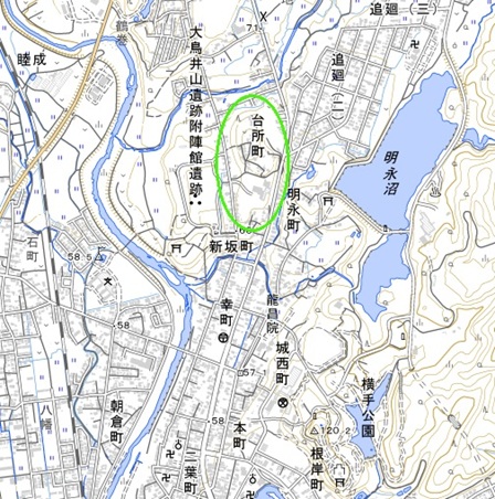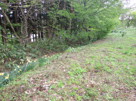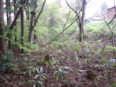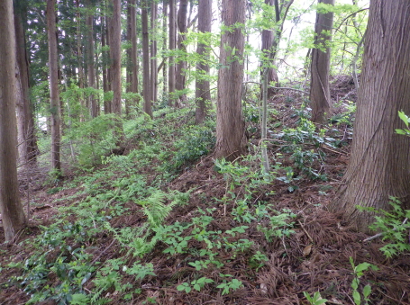 <沿革> 西側の大鳥井柵と不可分で清原氏の本拠地を形成していたものと推測される。 <手記> 大鳥井柵と同じく南北2つの郭から成り、どちらも二重の空堀が巡っていたようです。 こちらも国史跡の指定範囲のようですが、南郭は横手市公文書館によって破壊され、 北郭も住宅地や畑地となっています。 北郭西辺の林に分け入ると、二重空堀の名残と思しき細長い平坦面と、切岸状の 斜面が見受けられました。ほかにもよくよく探せば城柵跡につながるものが見つかる かもしれませんが、オフ会での団体行動から外れていたのとにわか雨が降ってきた こと、そして私有地が入り組んでいることから深入りはしませんでした。 |
