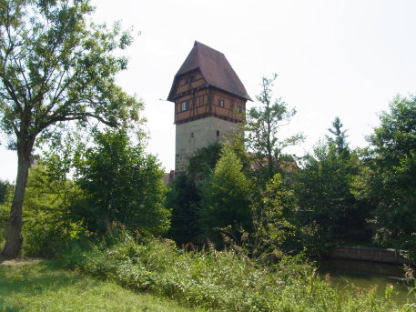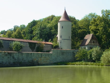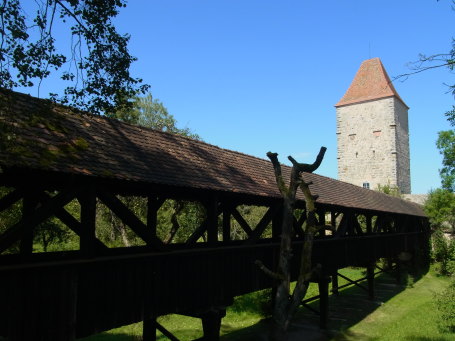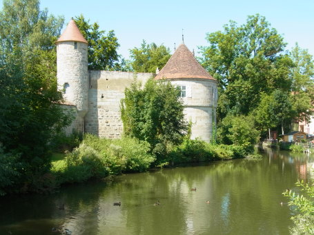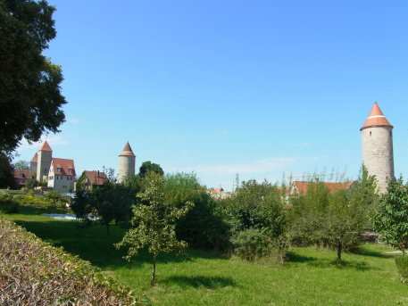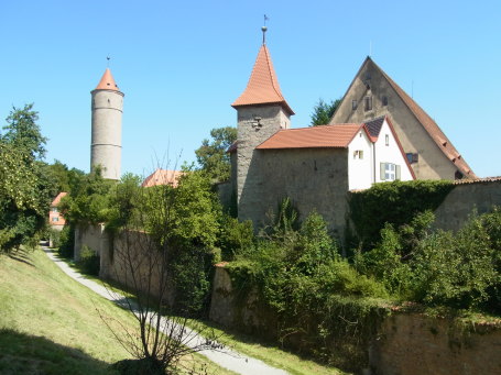 <沿革> 1188年、神聖ローマ皇帝フリードリヒ1世(バルバロッサ:赤髭王)が、「ティンケルスプーエル 城(Burgum Tinkelspuhel)」を五男のコンラート・フォン・ローテンブルクに与えたとする文書が 残っており、これがディンケルスビュールに関する史料上の初出とされる。南北と東西の2本の 交易路が交わるディンケルスビュールには8世紀ごろから入植が進んでいたといわれ、街道を 西に向かうとやがてフリードリヒ1世の居城が置かれたヴィンプフェンに至る。ヴェルニッツ川の 渡河地点でもあることから、シュタウフェン朝の防衛拠点として重視されたものとみられている。 1274年、ディンケルスビュールは帝国自由都市として認められた。しかし、その後市は統治 権をエッティンゲン伯家に抵当に取られては買い戻しを繰り返したとされる。1372年に、現在の 城壁の位置に市壁が建設された。また、14世紀中に市内にドイツ騎士団の館が建てられた。 17世紀の三十年戦争では、カトリック側とプロテスタント側で計8度にわたり占領されたが、 市街は壊滅的な破壊を免れた。 1802年にディンケルスビュール市は帝国自由都市の地位を失い、1806年にはバイエルン 王国に編入された。1826年に、バイエルン王ルートヴィヒ1世の通達により王国内の城塞の 勝手な破壊が禁止された。これにより、城壁を含めた旧市街の維持が意識的に図られるよう になった。2度の世界大戦に際しても、ディンケルスビュールはほとんど被害を受けることは なかった。 <手記> ディンケルスビュールは、ロマンチック街道のなかでもとりわけ中世の面影を色濃く残す町の 1つとして知られています。日本人におなじみのローテンブルクからヨーロッパバスで1時間半 ほどの近さにありながら、日本はじめ外国人旅行客が比較にならないほど少ない静かな町で、 個人的にはローテンブルクよりおすすめです。 都城としてのディンケルスビュールのみどころは、旧市街の外周に集中しています。市内の 観光は市販のガイドブックなどに任せることにしまして、都城としての魅力は外周の堀や城壁、 城門、塔などが完全に近い形で残っているところにあります。 北のローテンブルク門、東のヴェルニッツ門、南のネルトリンガー門、西のゼークリンガー門 の4つの大きな門が開かれ、その間に多くのサブの門や塔が立ち並んでいます。城壁の外側 は、東が川を引きこんだ水濠となっており、北は池となっています。南側の堀跡は畑地などに 転用されていてやや不明瞭ですが、西は空堀が二重になっているさまがよく残っています。 残念ながら、ローテンブルクと異なりこれらの塔や城壁に登ることはできず、上からの眺望を 望まれる方はマルクト広場の聖ゲオルク教会に登らなければなりません。 |