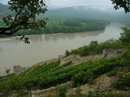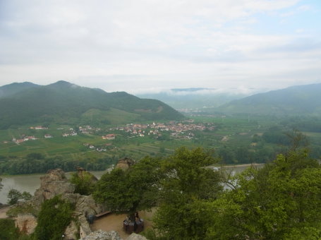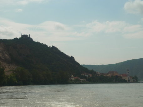 | デュルンシュタインの街並み(右手)と城跡(左手山上)。 | |