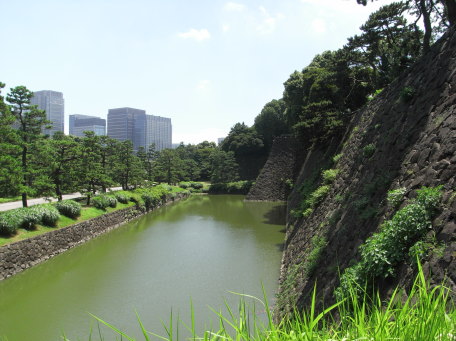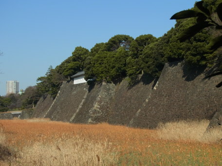 | 汐見坂から本丸の石垣と水濠を望む。 中世江戸城の大手にあたると考えられています。 |