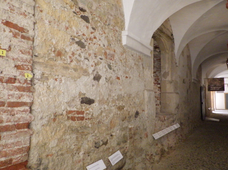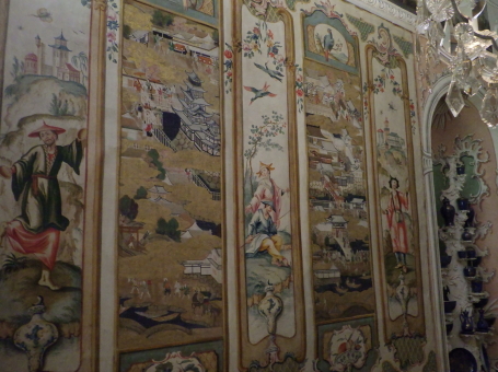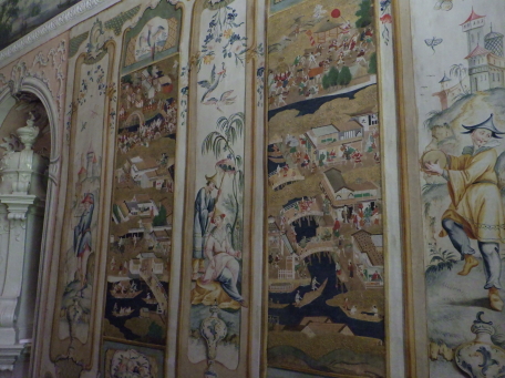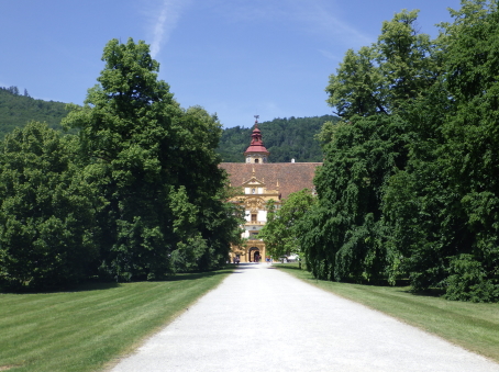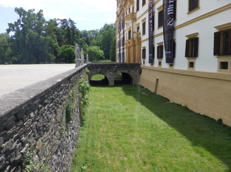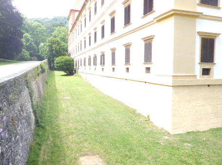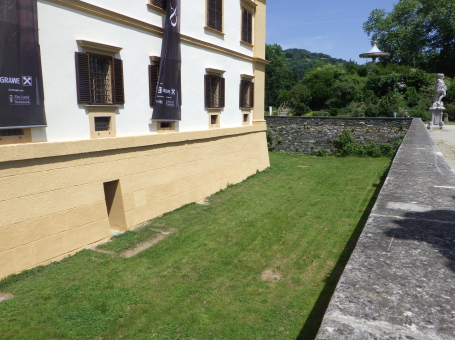 <沿革> 1460~63年の間に、バルタザール・エッゲンベルガーがアルガースドルフ家から土地屋敷を 購入し、居城として増改築した。エッゲンベルク家は、もともと現在のオーストリア南東端に位置 するラトガースブルクのワイン商として財を成していたが、バルタザールはシュタイアーマルク公 でもあった神聖ローマ皇帝フリードリヒ3世の知遇を得てグラーツやライバッハ(リュブリャナ)の 造幣局長として手腕を発揮し、エッゲンベルガー・ツー・エッゲンベルク家として貴族に列した。 1470年までに城内の礼拝堂が完成しており、城館の普請も完了していたとみられる。 1590年代に入り、分家であるエッゲンベルク・ツー・エーレンアウゼン家のルプレヒトがトルコ との戦いで活躍した功績により、エッゲンベルク一族はフライヘル(男爵)に昇格した。同家の 名をさらに高めたのが、バルタザールの曽孫でルプレヒトの従兄弟にあたるハンス・ウルリヒ・ フォン・エッゲンベルクである。彼はハプスブルク家の宮中顧問官首長および侍従長を務め、 神聖ローマ皇帝フェルディナント2世の摂政的な役割を果たして権勢を誇った。 皇帝の寵愛を受けて帝国諸侯にも列したハンス・ウルリヒは、1625年にエッゲンベルク城の 大改修に着手した。新しい宮殿の設計構想は宇宙的発想に基づいているとされ、四隅の塔は 四大元素を表し、窓の数は1年の日数(365)、3階の広間の数は1日の時間(24)、そして広間 の窓の総数は年間の安息日数(52)に拠るとされる。宮殿は1635年に一応の完成をみたが、 ハンス・ウルリヒ自身はその前年に死去した。絵画など内装の工事は、さらに1685年ごろまで 続けられたとされる。 1717年にヨハン・クリスティアン2世が没すると、エッゲンベルク家の男系は絶え、その姉婿に あたるヘルベルシュタイン伯ヨハン・レオポルトがエッゲンベルク城を相続した。ヨハンは1754~ 62年に城をロココ調へと改修し、19世紀には庭園が英国風に改められた。1939年、ヘルベル シュタイン家はエッゲンベルク城をシュタイアーマルク州に売却し、城は戦後の修復工事を経て 1953年から一般に公開されている。 2006年、宮殿内装の修復に際して東洋趣味の部屋に飾られた絵画が日本のものではないか として調査が行われ、豊臣期の大坂城と城下を描いた希少な屏風であることが判明した。元は 八曲一隻であったとみられ、一扇ずつ分解されて壁画に転用されている。この縁から、今日の 大阪城とエッゲンベルク城は友好城郭提携を結んでいる。 <手記> エッゲンベルク城はグラーツ市街の西方、盆地を形成する丘陵の麓に位置しています。広大な 庭園の中心に方形の宮殿が建ち、上から見ると礼拝堂を核として、周囲に建物を巡らしている ことが分かります。宮殿は一応空堀に囲まれていますが、少なくともハンス・ウルリヒ以降、城砦 としては顧みられていなかったでしょう。 建物の内部は、上述のとおり多くの部屋が整然と並ぶ一般的な宮殿です。そのなかで日本人 として特筆すべきは、やはり上記の「豊臣期大坂図屏風」でしょう。小部屋に配された屏風絵は、 室内には立ち入れないうえに照明がないため、快晴の夏の日でも薄暗く、肉眼では細部までは 見えませんでした。とはいえ、大坂城天守や堀に架かる橋々などは手前側の絵に描かれていた ため、言われてみれば大阪だなという市中の賑わいは実感できました。東洋趣味の部屋はもう 一つあり、そちらは中国風の絵などで飾られているため、こちらは近年「日本の間」と呼ばれて いるそうです。 中世城郭ファンであれば、地階の回廊沿いにある改修前の遺構露出部も、ぜひ見逃さないで いただきたいポイントです。壁面に古い城館の柱や基部(当初の城の基壇は今よりも60cmほど 高かった)、そして建物入口などが残っています。 ところでエッゲンベルク家は、上述の通りもとは商人でした。第一次ウィーン包囲後に財政難に 陥ったハプスブルク家を資金・経営面で支え、貴族にまでのし上がったという経緯は、地方領主 から帝国諸侯にまで昇りつめ、今も裕福な国家元首として続くリヒテンシュタイン家と似たような 感じを受けます。ただしエッゲンベルク家の栄光は長くは続かず、18世紀前葉には家名が絶えて しまいます。そのあたりの経緯も、エッゲンベルク城内で詳しく説明されていました。 |