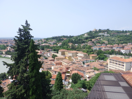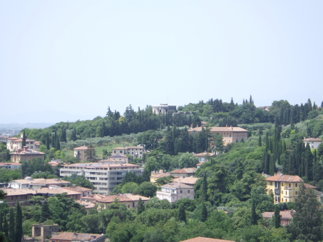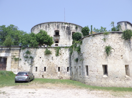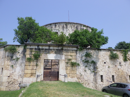 <沿革> 1815年にハプスブルク帝国が計画したヴェローナ防衛システムの一端を担う城砦である。 1838~41年にかけて、ヴェローナの弱点である北側の丘陵地帯を守る目的で建設された。 要塞の名は、皇帝フランツ・ヨーゼフの母であるバイエルン大公女ゾフィーにちなんでいる。 ヴェローナは1866年にイタリア王国領となったが、城砦が実戦を経験することはなかったと みられる。 <手記> 上述のとおり、ヴェローナ市街の北側の丘上に築かれた小要塞です。すぐ背後により高い サン・レオナルド城砦やサン・マッティア城砦があるようですが、歩いていくのはしんどいので ここだけ登ってまた市壁沿いへ下りました。 近世的な城壁の内側に近代的な円塔が建っていて、その上の砲台は360度回転するよう になっているそうです。入り口は閉鎖されていてぐるっと外側を巡るだけでしたが、背後には 堀切も認められ、近世と近代の中間的な様相が見て取れます。 |