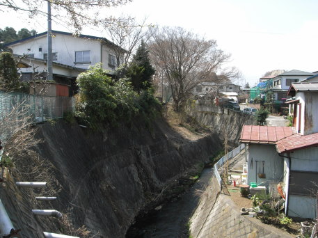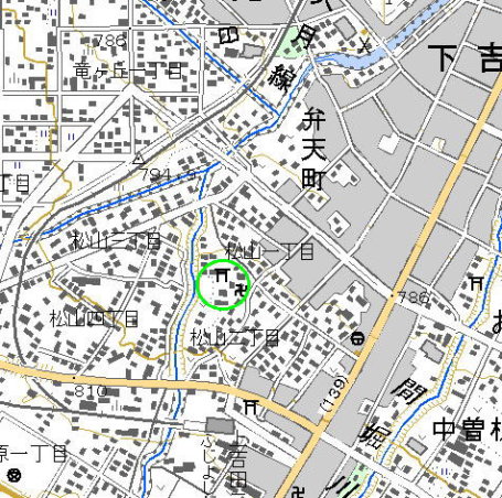 <沿革> 『妙法寺記』の天文五年(1536)の項に、「小林刑部左衛門殿松原さきを屋鋪に御立候」とある。 松原崎は松山の西部を指すもので、松山館はこのときに小林刑部左衛門房実によって築かれたと されている。小林氏はもともと河口湖畔の船津を本拠とし、郡内領主小山田氏の重臣として活躍 していた。 同書の天文八年(1539)の項には、「小林刑部左衛門殿、松山を御立て候」とある。詳細は不明 だが、松山館の改修もしくは居館を松山へ移したことを指すものと推測される。 廃城時期は不明だが、小林氏は天正十年(1582)に武田氏および小山田氏が織田信長に滅ぼ されると、運命をともにしたといわれる。 <手記> 松山館跡は、現在松尾神社の境内となっています。周辺には館跡を示すものは何もありません。 『中世城館調査報告書集成』には土塁が残っているとありますが、見落としたのか消滅したのか、 見つかりませんでした。 とくに周囲に対して高くなっているというわけでもなく、館の西を流れる神田堀川が名前のとおり 館背後の堀の役割を果たしているのが、唯一の要害といえます。富士吉田駅のすぐ北側にあり、 現在の富士吉田市の発展の基礎となった館ともいえるでしょう。 |