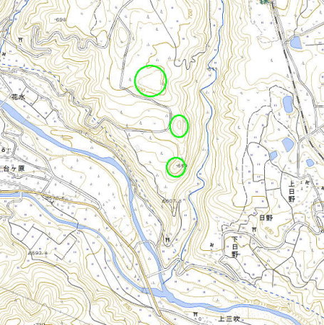 <沿革> 『北巨摩郡誌』に、「深沢城址、下中丸の東方にあり、城山と称し大深沢山に面せる丘陵に して武田の家臣深沢民部の城砦なりと」とある。深沢民部なる人物については不明である。 天正十八年(1582)八月二十九日、天正壬午の乱の局地戦である花水坂の戦いが深沢砦 南麓で行われた。この戦いでは、徳川方についた柳沢信俊・山高信直ら武川衆が北条氏の 「間者」中沢某を討ち取ったとされる。中沢某ら攻められた北条方の軍勢がどのような性質の ものであったか詳細は明らかでないが、『日本城郭大系』ではこのとき北条氏の軍勢が深沢 砦に陣取っていた可能性を指摘している。 <手記> 深沢砦は、釜無川とその支流大深沢川に挟まれた舌状の丘陵上にあったとされ、『大系』 によれば、3つのピークに分かれて遺構が存在するとされています。『郡誌』にいう大深沢山 がどこを指すのかは定かではありませんが、下中丸の東方にある城山というと、どちらかと いえば中丸砦の方があてはまるようにも思われます。ただ、『大系』の指摘する通り、これら 3つの峰にそれぞれ遺構が認められるのは事実です。 3つの峰にとくに名前は付けられていないようですが、ここでは便宜上北から北城・中城・ 南城と呼ぶことにします。3つ峰のなかで、もっとも手っ取り早く遺構を確認できるのは、北城 です。北城の西側は、資材置き場か何かになっていて、見通しよく城域までたどり着けます。 北城は、長い土塁線で囲まれた広大な空間です。土塁についても、単調でそれほど高さも ありません。『大系』の指摘する天正壬午の乱における北条軍が、兵の駐留用に築いたもの であることは、想像に難くありません。 北城から中城へ峰伝いに歩こうとすると、植えられて間もないと思われる植樹林に行く手を 阻まれました。木の背丈がまだ低すぎて、雑草や茨の繁殖力の方が勝ってしまっているため です。中城へは、隣接する林道から直登するのがベターです。中城は、北城とうってかわって 技巧的な城です。歩くことはできるとはいえ低木が多くて見通しは良くなく、全体的な縄張り については把握しきれませんでしたが、少なくとも土塁をもって城内を複数の曲輪に区切り、 大深沢川の谷方面に2つの虎口を開いているように見受けられます。 北側の虎口跡が中城の北端とみられ、その先には小さな谷地形があり、その向こうには また小規模な舌状地形があります。ここにも、土塁と曲輪跡と思われる削平地があります。 この部分は、ちょうど北城と中城の中間付近にあたり、両者の関係はかなり緊密であったと 推測されます。 他方で南城は、中城とは尾根続きで繋がっているというのに、自然地形が続いています。 というよりも、南城は3つのなかでもっとも遺構の確認が困難です。ピークの周縁に土塁跡と 思われる土盛り状地形が認められるほかは、私が見たかぎり造作はみられませんでした。 南城へは、先述の通り中城から尾根伝いに行くこともできますが、上の地図には掲載されて ないものの、西麓に数軒の別荘のような家屋が建っており、その脇から登ることもできます。 相対的にみて、少なくとも北城と中城の2つは、北条氏によって築かれたか改修されたもの とみて良いのではないかと思われます。他方で、南城だけが抜きんでて造作に乏しいという 点が気になります。南城については、深沢民部なる人物の城砦だったとみることもできるかと は思いますが、先の別荘地を除けば周囲には寒々たる植樹林が広がるのみのこの台地上 に、はたして在地領主が城を築くものか疑問です。あるいは、南城は武田氏によって烽火台 として使われていたとも考えられますが、推測の域を出るものではありません。 |