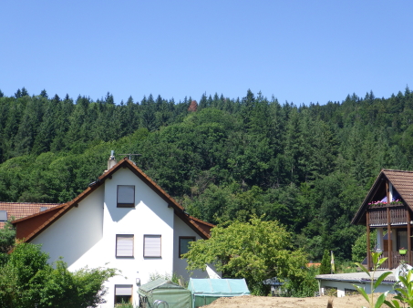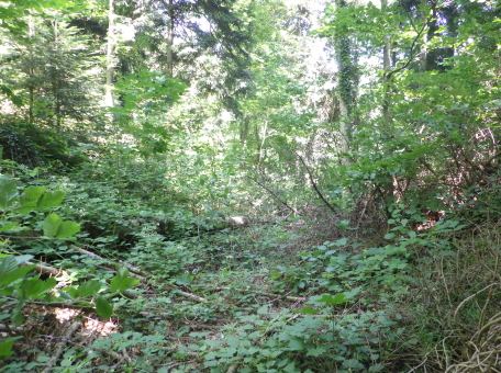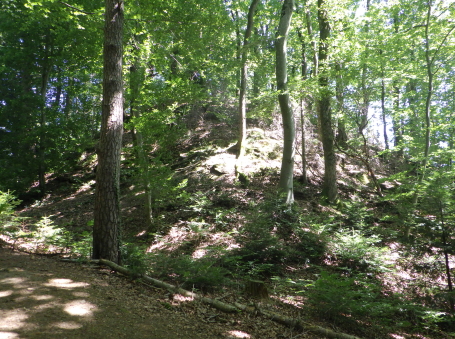 <沿革> 史料にはみられない城跡である。南東のヴィースネック城主ハイガーロッホ伯が、フライブルク のツェーリンゲン家と争うなかで築かれたとも考えられているが、確証はない。また、ヘレン渓谷 を遡ったファルケンシュタイン城のファルケンシュタイン家との関連も示唆されている。 <手記> ガルゲンビュールと呼ばれる小山(ビュールは丘の意)の先端に突き出た小ピークに築かれた 小規模な城砦です。南麓にはその名もブルク(城)という名前の集落があり、ブルク・バイ・ブルク (ブルクの城)とも呼ばれるようですが、集落名はこの城とは無関係で、ヴァーゲンシュタイク川と ヘレンバッハ川に挟まれた区域にかつて存在したタロドゥヌムというケルト人の居住地に防備が 施されていたことにちなむそうです。 西麓から城跡の背後まで軽トラ道が延びており、グーグルマップに示されている地点は実際と ややずれています。モット・アンド・ベイリー様式の単郭の城砦で、背後鞍部に堀切、南西中腹に 横堀がみられます。堀がぐるっと城山を巡っていたのかは定かでなく、少なくとも現況では南東の 尾根がそのまま麓まで通じているようでした。 郭内はさほど広くはなく、部分的に低い土塁状地形が残っています。この城跡はどこを取っても 日本の城跡と言われても気付かない感じで、あるいは急拵えの掻き上げ城とて建造物は木造で あった可能性も考えられます。ハイガーロッホ家とツェーリンゲン家の争いが始まった1100年ごろ から、ヴィースネック城が攻め落とされたとされる1118年までのごく短い期間に存在したとすれば、 規模の小ささや史料に見られない点も理解できるでしょう。 ちなみに、尾根伝いのさらに高所のピークにも、同様の城跡がもう一つあるそうです。私は調べ が足りずに行きそびれてしまいましたが、再訪できる機会はあるのでしょうか^^; |