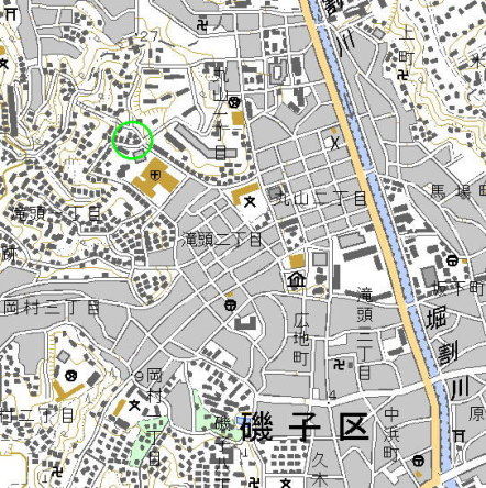 <沿革> 『新編武蔵国風土記稿』には、「村の戌の方にあり、来由詳ならず」とある。周辺は、 古来三浦氏一族とされている平子氏の所領であり、玄蕃屋敷も平子氏一族かその 家人の館と考えられている。平子氏は、大永年間(1504〜20)後期ごろに北条氏に よって磯子を逐われた。 <手記> 脳血管医療センター北西隅の四つ辻に石地蔵があり、この付近に存在したものと 推定されています。遺構や案内はありません。 屋敷跡の南700mほどのところに平子氏館があったとされ、両者は滝頭の谷戸を 挟んで向かい合っています。また屋敷の北400mほどのところには、平子氏一族の 石川氏の館もあったとされ、玄蕃屋敷が平子氏一族ないし家人の館であったとする のは想像に難くありません。屋敷跡は三方を峰に囲まれた館地形にあり、峰側にも 餓鬼谷や堂免谷、扇ヶ谷といった小谷が入り組んでいます。おそらく、平子氏館から では目が届ききらないこういった小谷を管理する目的もあったものと推測されます。 |