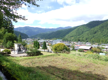 | 境内下段の田んぼと眺望。 左側は井戸家の墓。 |