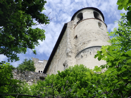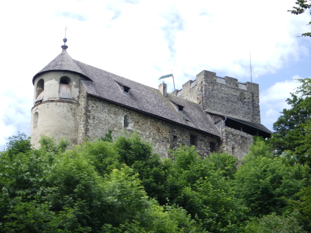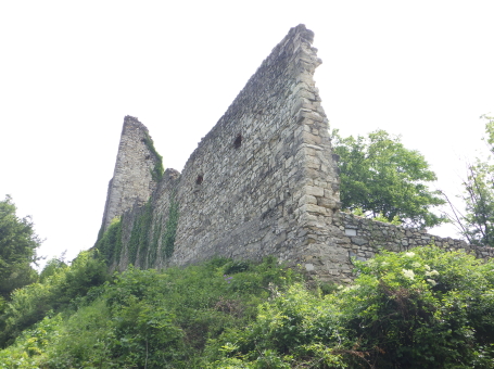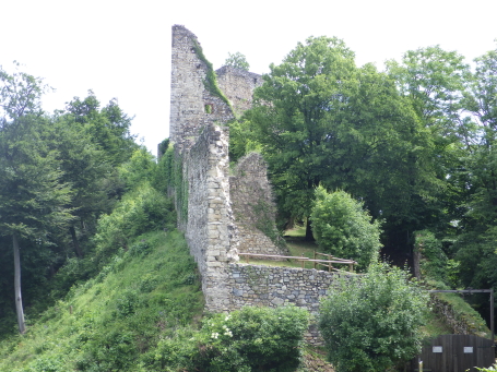 <沿革> 1042年、神聖ローマ皇帝ハインリヒ3世が辺境伯ゴットフリート・フォン・ピッテンに城と荘園を 与えたとするのが史料上の初出とされ、経緯は定かでないが11世紀中に築かれたものと考え られている。同世紀の叙任権闘争を通じて、城はケルンテン伯エッペンシュタイン家の所有と なった。1122年にケルンテン公ハインリヒ3世が没すると、トラウンガウ家のシュタイアーマルク 辺境伯オットーカール2世の手に帰した。 1138年には、城伯としてズートガー・フォン・ゲステニツェの名がみられる。1260年にはホイン ブルク家が、14世紀末にはヴィンディシュ=グレーツ家が城伯となった。15世紀には大規模な 拡張工事が始められ、1461年に現在の縄張りが完成したとされる。背景にはオスマン・トルコ の脅威があり、1480年には実際にトルコ軍の攻撃を受けたが、イェルク・ヴァイセネッガーが これを撃退した。 16世紀に入ると城は売買と抵当の歴史を歩むことになるが、一方で対トルコの要塞化も進め られたとされる。1622年には三十年戦争の戦費調達のため、神聖ローマ皇帝フェルディナント 2世がゲスティング城を、ハプスブルク家の宮中顧問官首長として権勢を振るっていたハンス・ ウルリヒ・フォン・エッゲンベルクに売却した。 1680年、シュロスベルクで火災が発生すると、グラーツの火薬庫が一時ゲスティング城内へ 移された。1707年には、アテムス伯イグナーツ・マリアがエッゲンベルク家から城と領地を購入 している。 1723年、落雷により火薬庫が爆発し、主塔や礼拝堂を除く大部分の建物が灰燼に帰した。 アテムス伯は城を再建することなく、山麓にバロック様式の宮殿を造営した。1790年ごろから 残った建物の荒廃が進行し、1843~44年には北辺の城壁が取り崩され、石材が鉄道建設に 用いられた。 1925年にはゲスティング城協会が発足し、大規模な修復が行われた。 <手記> ゲスティングはグラーツ市街北西山沿いの地域で、城はムール川沿いに細く伸びる峰上に 築かれています。一応ピークとはいえ、やや中途半端な位置にあり、要害性の面からみれば もっと先端側の小さな礼拝堂が建つあたりの方が相応しいように感じされます。これは、ゲス ティング城がグラーツ方面だけでなく、ムール川上流方面の監視と交通路掌握を目的として いたからのようです。グラーツ中央駅や旧市街からゲスティング行きのバスに乗って終点で 降りれば、城跡まで一本道の山道が延びています。 2020年まで、城はレストランなどとして利用されていたそうですが、閉店した後に市が借り 上げているそうです。しかしながら、費用面から全体的な修復や保存はなされず、予約制の ツアーでのみ見学可能となっているようです。建物内部はともかく、周辺の曲輪については 公開してくれてもいいのにと思うのですが、個人での訪城は困難でしょう。 城山の前後は堀切だったのかなんとも言えない鞍部で区切られ、背後の鞍部の奥からは 背部の城壁を目の前に望めます。また前方鞍部からは、トップ画像のように建物を見上げる ことができます。城山の背後へ向かう山道の脇には藪に埋もれた堀底道が残り、あるいは 大手道の名残かもしれません。その先にも出入口がありましたが、当然ながら封鎖されて いて、そこから最後に建物を真上に見上げて下山しました。 これだけの遺構、もったいないのでぜひ一般に公開してもらいたいところです。 |
