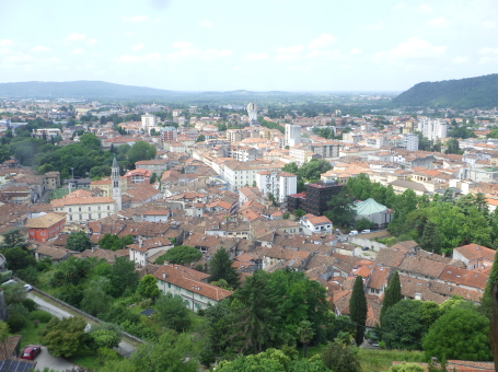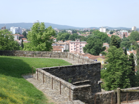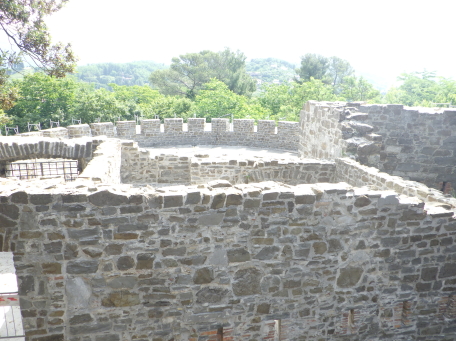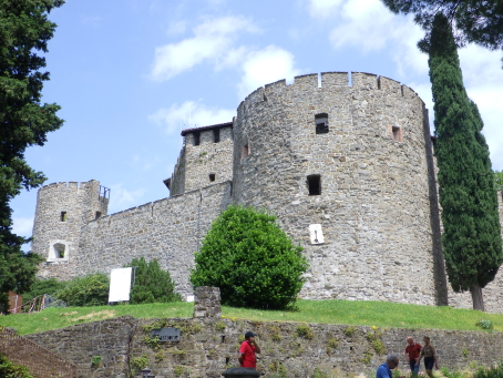 <沿革> ゴリツィアの史料上の初出は、1001年4月28日付の神聖ローマ皇帝オットー3世の文書と される。アクイレイア総司教ヨハネスとエッペンシュタイン家に城と領地を分け与えるとする 内容で、その中に「スラブの言葉でゴリツァ(Goriza)と呼ばれる村」が登場する。城について も今日のゴリツィア城を指すとすれば、このときまでに築かれていたことになる。ゴリツィアの 地名はスロベニア語で小山を意味するgoricaに由来すると考えられていることから、古くから スラブ人の城砦ないし高地性集落が存在したとする説もある。 1122年にエッペンシュタイン家が無嗣断絶すると、姻戚のハインリヒ4世・フォン・シュポン ハイムが遺領とケルンテン公の地位を継承した。彼はゲルツ伯(ゴリツィアのドイツ語名)を 称した最初の人物ともいわれるが、翌1123年に死去した。代わって、アクイレイア総司教と 密接な関係を築いていたマインハルディナー家のマインハルト1世が台頭し、1127年までに ゲルツ伯を称していた。マインハルト1世の兄エンゲルベルト1世はバイエルンの宮中伯で あったとされているが、両者の関係性については不明な点が多い。 13世紀に入り、城主の居館や2階建ての建物などが整備された。1232年、マインハルト 3世・フォン・ゲルツはチロル伯アルベルト3世の娘と結婚し、チロル伯領を統合した。その子 であるマインハルトとアルベルトの兄弟は広大な領土を分割し、前者がチロルを、後者が ゲルツを相続した。マインハルトは後に、神聖ローマ皇帝ルドルフ1世を援けてケルンテン 公領を獲得したが、その際に無嗣断絶した場合はハプスブルク家に所領を譲ることを約束 した。14世紀半ばにチロル伯マインハルディナー家は実際に男系が断絶し、ハプスブルク 家に広大な領土が譲渡された。 一方のゲルツ伯家は、13世紀後半ごろからヴェネツィア共和国の攻勢に晒され、1278年 に居城をチロルに近いリーエンツのブルック城へと移した。その後も、所領分割などにより 勢力を漸減させていき、1500年にレオンハルト・フォン・ゲルツが没するとゲルツ伯マイン ハルディナー家も断絶し、遺領はハプスブルク家の皇帝マクシミリアン1世が継承した。 マクシミリアン1世はレオンハルトの執政であったヴィルギル・フォン・グラーベンを自らの 顧問として登用し、新たなゲルツ城代に任命した。しかし、1508年にマクシミリアン1世が ヴェネツィア共和国を攻撃して大敗すると、ゲルツ城は同国に占領された。ヴェネツィアの 支配下において、ゲルツ城は要塞として強化されたが、翌1509年にはハプスブルク家に 奪還された。 その後、ゲルツ城はゲルツ伯を継いだハプスブルク家の拠点城の一つとなった。18世紀 には、堡塁や城壁などの拡張工事が行われたが、この城で攻防戦が行われることは最早 なかった。第一次世界大戦の爆撃で被害を受けた後、1934~37年にかけての修復工事 に寄せて中世の外観へと戻され、今日に至っている。 <手記> ゴリツィアはイタリアの北東部に位置する国境の街で、城山のすぐ裏手はもうスロベニア です。第一次大戦後に、いわゆる「未回収のイタリア」として伊領に組み入れられましたが、 歴史上は上述のとおり、ヴェネツィアに占領された約1年を除いて、「イタリア」だったことは ありません。近世には海にほど近いリゾート地として、ほとんどの領地が内陸にあるハプス ブルク帝国の貴族たちが集ったのだそうです。 市街を見下ろす独立丘にあり、中央駅からはやや距離があります。要注意なのが駅にも 観光案内所にも荷物を預けられないという点です。城の受付では預かってくれたのですが、 そこまではバックパックの全荷物を背負って城山を登らなくなりませんでした。 城は居館部とそれに近接して巡る内側の城壁、そして稜堡などを伴いやや広く囲く外側の 城壁の大きく3セクションから成っています。私が訪れたときは居館や内側城壁が修復中で、 展示物などは観覧できましたが、残念なことに城壁上を歩くことはできず居館からの眺望も 限定的でした。とはいえ、館内の展示は充実していてとても勉強になりました。とくに上記の ゲルツ伯の4世紀弱における隆盛と没落の物語は、盛者必衰のことわりを表しているようで たいへん興味深く感じます。 |