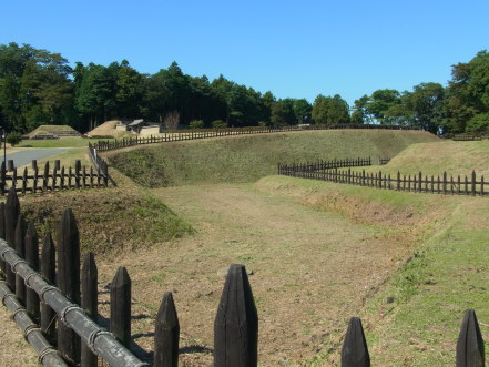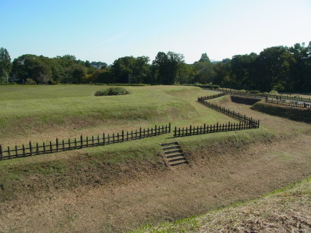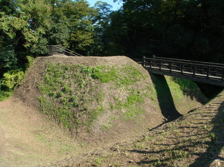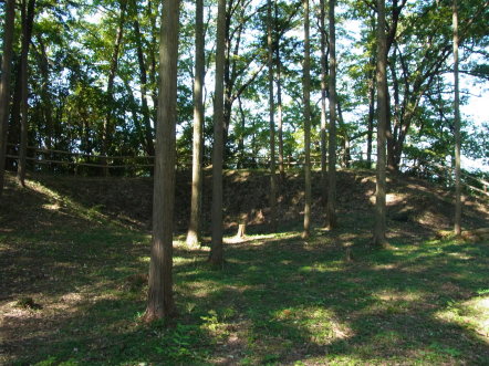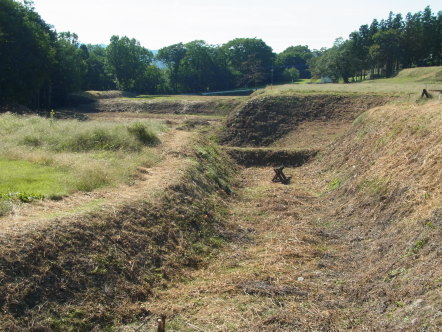 | 伝秩父曲輪から二曲輪の堀・犬走り・土塁を望む。 堀・土塁とも控えめに復元されています。 |