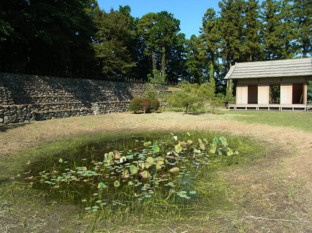 | 伝秩父曲輪の池泉および御殿建築跡、 ならびに5段の石積み土塁。 |