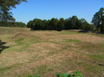 | 二曲輪深沢川側の馬出の堀。 奥が泉水跡で、両者を分ける水戸違いの畝が見えます。 |