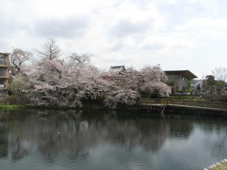 | 大岳院池端から今泉城址(大岳院)を望む。 桜並木のあたりに、以前は土塁跡があったそうです。 |