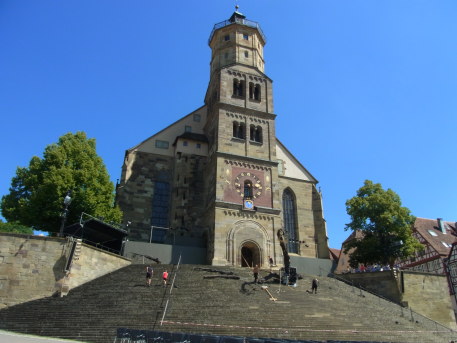 | おまけ:マルクト広場から聖ミヒャエル教会を見上げる。 夏場は教会前の階段で連日野外劇が催されます。 |