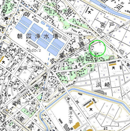 <沿革> 浜崎峡(はけ)と呼ばれる台地上に「ジンヤ」の小字があり、『中世城館調査報告書集成』では浜崎 陣屋の存在を指摘している。周辺は浜崎遺跡として古墳などが発掘されているが、陣屋遺構に相当 するものは見つかっていない。 浜崎村には深津氏・三枝氏・富永氏などの旗本領があったとされているが、これらの諸氏が陣屋を 構えていたとする記録や伝承はなく、陣屋が存在したことの証拠は得られていない。 <手記> 浜崎陣屋があったのではないかと考えられている「ジンヤ」は、黒目川と新河岸川の合流点に突き 出た舌状台地上にあります。近くには峡の山古墳がありますが、陣屋等の遺構は見つかっていない ようです。 むしろ、黒目川と新河岸川という重要な河川の合流点に臨む舌状台地の先端ですから、陣屋という より中世城郭の可能性の方が高いのではないかと思われます。台地の南麓には旧家須田家の広大 な屋敷があり、陣屋を建てるのならこの周辺の方がふさわしいように感じました。先端部の方は何か 建物が建っていて、まだ発掘はなされていないようなので、調べてみれば新たな発見があるかもしれ ません。 |