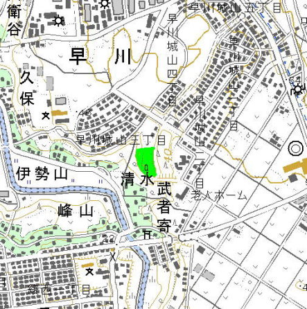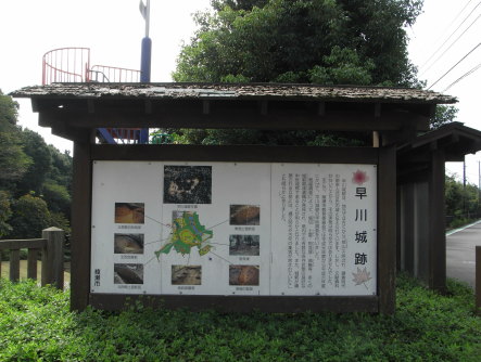 <沿革> 渋谷氏の庶流早川氏によって築かれたものと考えられている。『渋谷氏系図』によれば、 渋谷庄司重国の次男高重が早川次郎を名乗っており、重国か高重の代に高座郡渋谷庄 から早川へ進出し、城館を築いたものとみられる。 渋谷氏は高重が継いだが、建暦三年(1213)の和田合戦で和田義盛に属して戦死した。 高重の死を受けて、高重の兄吉岡太郎光重が渋谷氏を継いだ。その後、光重の次男実重 が早川次郎を名乗っている。 宝治二年(1248)の宝治合戦の戦功により、渋谷一族は薩摩地頭職に任じられ、実重も 薩摩国へ下向した。実重は薩摩で東郷氏を称した。 今に残る早川城の構造は、少なくとも室町時代までは下るものとみられ、また現地からは 14世紀に作られたとみられる火舎片が発見されている。そのため、早川氏の下向後に早川 一帯を支配した者がいたと推測される。現地の説明では、渋谷氏の一族が残って支配を 続けたものと推定している。 天正十八年(1590)に徳川家康が関東へ入ると、この地に石川春久・重久父子が陣屋を 構えたとされる。石川氏は渋谷氏の末裔とも伝えられているが、詳細は不明である。 <手記> 城跡一帯は城山公園として整備されています。公園化に伴い、平成元〜六年(1989〜 94)にかけて学術調査が行われ、多くの遺構が見つかっています。そのため、史料には まったくといってよいほど現れない反面、城のおおよそのようすは明らかとなっています。 早川城は、目久尻川とその支脈が形成する舌状台地を利用した城です。台地の頸部を 空堀と土橋で切断し、単郭を基調とした縄張りとなっています。東側は急峻な沢谷戸と なっていて、こちらは土塁と空堀だけで対応していますが、斜面がやや緩やかな南面と 東面には複数の腰曲輪ないし帯曲輪が設けられています。公園化はされているものの、 これらの遺構は説明付きで示されていて、保存状態は良好であるといえます。 ちなみに、東郷氏の末裔には示現流開祖の東郷重位や、日本海海戦で活躍した東郷 平八郎がいます。早川城主郭南西端には櫓台と伝わる塚があり、その上に東郷平八郎 の顕彰碑が建てられています。 |