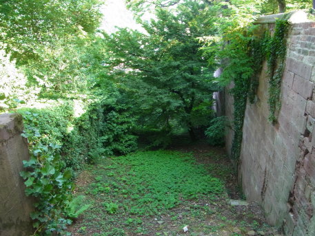 主郭の堀。手前の廃墟は南西隅の牢獄塔跡。 | |