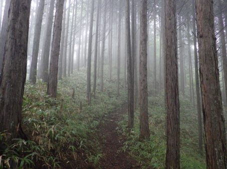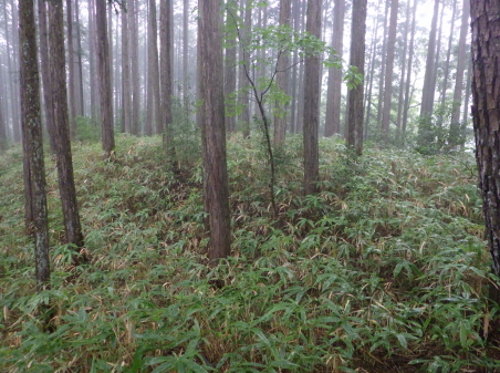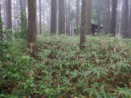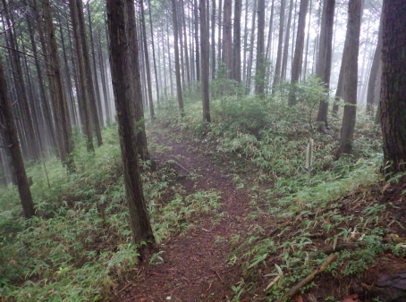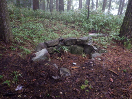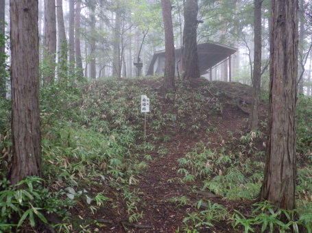 <沿革> 応永十八年(1411)、幕府の命で飛騨の乱を鎮圧した飛騨守護・京極高光の弟・高数(高員)は、 褒賞として与えられた所領のうち、益田郡竹原郷に三木正頼を送り込んだ。三木氏は、京極氏と 同じ佐々木源氏流の多賀氏の庶流とも、藤原秀郷流ともいわれ、近江国甲賀郡の三ツ木城(現・ 甲賀市水口町新城)を発祥とするとされるが、詳しい来歴は明らかでない。 正頼の子・久頼は、京極本家の手の及ばない飛騨で頭角を現し、益田郡全体を掌握するまでに 成長した。しかし、応仁の乱を機に京極家内が分裂して争うと(京極騒乱)、飛騨国内でも対立が 生じ、久頼は文明三年(1471)の戦いで討ち死にした。跡を継いだ子の重頼も、美濃の斎藤妙椿 と結んで勢力を拡大し、永正元年(1504)には木曽谷へ侵攻し、木曽義元を敗死させるなど優秀な 人物であったようだ。 重頼の子・直頼の代になると、三木氏は飛騨南部を完全に支配下に収め、その目は飛騨中部へ 向けられた。直頼は北の桜洞城へ居城を移し、戦国大名への大きな一歩を踏み出した。宮地城の その後については定かでない。 <手記> 宮地は飛騨国のほぼ端っこにあたり、南東の舞台峠を越えると美濃国です。宮地城は宮地神社 から細尾根をダラダラと登った先の、比高130mほどの峰上に築かれています。車は神社南西麓の 竹原公民館に駐車可能で、境内からいったん背後の鞍部へ下りると、そこから城内まで登山道が しっかり付いています。私が訪れた日は雨が降ったり止んだりでしたが、傘を差しながらでも難なく 登城できました。 主郭の前後に1条ずつ、そして城域最前部にももう1条の堀切が穿たれ、前方尾根には2〜3段の 腰曲輪が付属しています。主郭前方部には御嶽神社が祀られ、井戸跡らしき石組みもありました。 主郭は縦に長く、前後2段に分かれているようにも見えますが、後方部は笹薮に覆われていてよく 分かりません。 規模は小さめでコンパクトながら、造作はしっかりしており、個人的な印象では国境の支城として、 三木氏(姉小路氏)の滅亡まで維持されたのではないかと思います。当時、舞台峠を越えた街道は 野尻で北上し、宮地城付近ないし現在の下呂CC付近の尾根を渡っていたのではないでしょうか。 そして宮地から乗政川沿いにまた少し北上して、初矢峠を越えて下呂に向かったとすると、宮地城 の意義も見えてくるような気がします。 それにしても飛騨の南の端っこから北上し、ついには一国を制圧するまでに成長するというのは、 戦国大名のなかでもかなり成功した事例ではないでしょうか。記録通りであれば、三木氏は6代も 連続して優秀な当主を輩出していることになり、もっと注目されてもよいのになぁ感じます。そんな 三木氏のはじまりの場所として、訪れて感慨深い城跡でした。 |