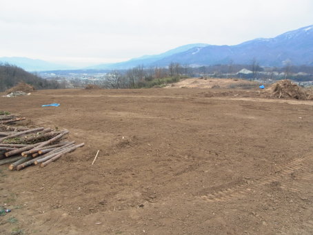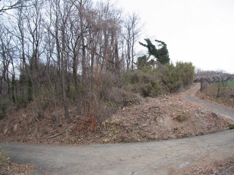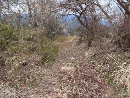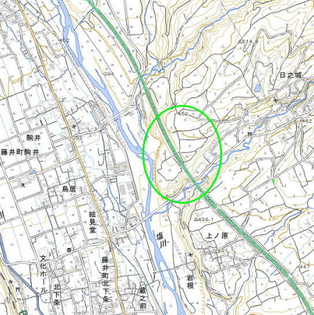 <沿革> 応永二十七年(1420)、甲斐守護武田信元が死去すると、守護代跡部明海・景家父子が 事実上の守護のごとく権勢をふるった。これに対し、信元の兄信満の次男信長の長男伊豆 千代丸が反発し、跡部氏と抗争状態に陥った。鎌倉府に出仕していた信長も帰国し、さらに 甲斐の国人集団である日一揆もこれに加わった。日ノ出砦は伊豆千代丸方の拠点となった が、このときに築かれたのかどうかは定かでない。 跡部氏は、日一揆と対立していた輪宝一揆と組み、永享五年(1433)に荒川(甲府市)で 合戦に及んだ。この戦いで伊豆千代丸は戦死し、武田方は総崩れとなった。信長は駿河へ 落ち延び、日ノ出砦も陥落したものと思われる。甲斐守護には跡部氏の了解のもと信長の 兄信重が迎え入れられたが、日ノ出砦の処遇については不明である。 天正十年(1582)の天正壬午の乱に際し、日ノ出砦は徳川家康によって取り立てられたと される。同年中に乱が終結すると、砦は役目を終えて廃城となったものと推測される。 <手記> 日ノ出砦は、塩川とその支流三之蔵沢に挟まれた台地の先端に位置しています。城内を 中央自動車道が貫通しており、両サイドは「砦橋」で結ばれています。その東詰に城址碑と 説明板が建てられており、ちょうどこの辺りが本丸とされています。説明板によれば、上の 地図の緑丸で囲んだ台地の範囲がおおよその城域だそうです。ただ、15世紀前半の国人 一揆にしてはさすがに巨大過ぎるように思われるので、徳川氏によって兵の駐屯用に拡張 されたときの最大エリアなのでしょう。おそらく、日一揆のころの城域は石碑周辺が北限と 推測されます。 橋を渡った先端部は、私が訪れたときには見渡す限りの更地になっていました。かつては 塚などがあったようですが、何かの施設でも建つのか平らに均されていて城跡らしい遺物は 見受けられませんでした。 石碑の北には、土塁跡とされる段差と堀跡とされる窪地の農道があります。さらにその北 の崖端にはのろし台とされる一角があるのですが、具体的に遺構なのかどうかは判断でき ません。その他の城内は耕作放棄地や畑地となっています。遺構が残っていそうであまり 残っていないので、なんとも歯痒く感じられました。 |