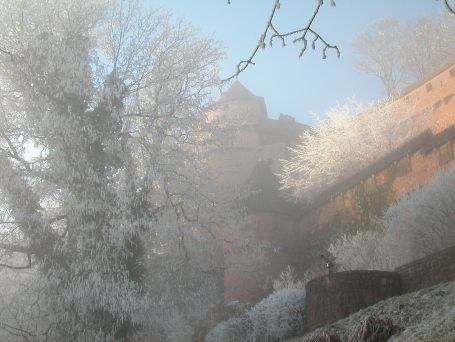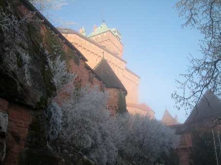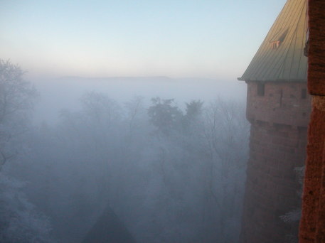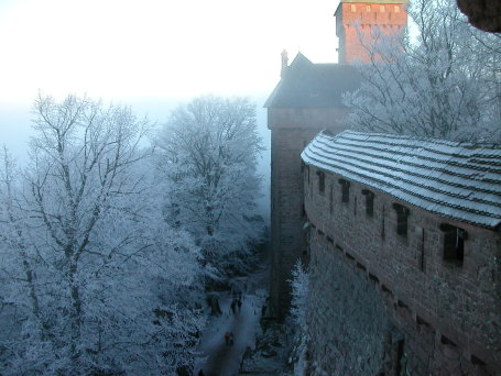 <沿革> 12世紀前半ごろ、ドイツ皇帝フリードリヒ1世(赤髭王:バルバロッサ)の父シュヴァーベン大公 フリードリヒ1世によって築かれたと考えられている。1147年に、「シュタウフェン家の城」として 史料に現れている。1192年からはキンツブルク城と呼ばれた。13世紀には、城はロレーヌ公 (ロートリンゲン公)の所有となった。その後、城と周辺の領地はエッティンゲン伯フリードリヒ2世 に抵当に入れられていたが、エッティンゲン伯は1359年に城をストラスブール大司教に売却した。 1454年、キンツブルク城はプファルツ選帝侯フリードリヒ1世によって攻め落とされ、1462年には 盗賊騎士団により破壊された。1479年、キンツブルク城は神聖ローマ帝国皇帝フリードリヒ3世 によってティーアシュタイン伯に与えられた。しかし、1517年にティーアシュタイン家は無嗣断絶と なったため、皇帝マクシミリアン1世に返された。 三十年戦争さなかの1633年、キンツブルク城はスウェーデン軍に包囲され、52日間の攻城戦 に耐えたものの、9月7日に開城した。以後、廃墟として様々な所有者の手に渡った。 1871年、普仏戦争に勝利したプロイセンがドイツ帝国を建国し、エルザス=ロートリンゲン地方 は帝国領となった。1899年、シュレットシュタット市(現在のセレスタ市)が城を皇帝ヴィルヘルム 2世に献上し、1901~08年にかけて、建築家ボードー・エプハルトによって修復工事が行われた。 修復費用の大部分をエルザス=ロートリンゲン州が捻出したため、ドイツ帝国に属したばかりの 同地域にとって多大な負担となった。 1919年、第一次世界大戦の戦後処理によってアルザス=ロレーヌ(エルザス=ロートリンゲン) がフランス領となると、城もフランスの国有財となった。2007年からはバ=ラン県の所有となって いる。 <手記> フランス語でケーニクスブール城、ドイツ語でケーニヒスブルク城と呼びます。どちらも「王の城」 という意味です。周囲の諸城に比べてやや高い山の上にあり、細長い船艇のような縄張りをして いるのが特徴です。 アルザス地方の城は朽ちたままのものが多いのですが、この城は「修復」以上に立派に再建 されていて、アルザス南部の観光の目玉の1つにもなっています。私が訪れたのはクリスマスの 頃だったので、写真には雲海が広がるのみですが、夏場の晴れた日にはアルザス地方を一望 できるだろうと思います。雲海と樹氷に覆われたメルヘンの城というのも、幻想的で綺麗でしたが。 アルザス=ロレーヌといえば、ドイツとフランスの長年の係争地であり、現在では欧州連合の 中心地の1つとなっています。ケーニクスブール城もドイツによって築かれ、スウェーデンによって 落とされ、再びドイツによって再建され、現在ではフランスの所有という、数奇な運命をたどって います。 |