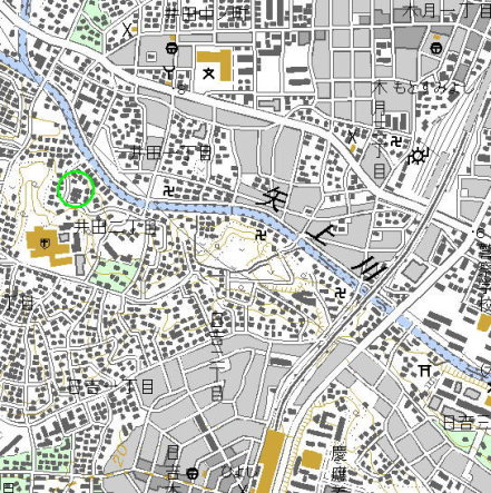 <沿革> 『新編武蔵国風土記稿』に、「鎌倉将軍の時本間五太夫某と云人の陣屋あとなりとぞ 本間が事はその詳なることをしらず」とある。記述が事実ならば、鎌倉時代の館跡という ことになるが、詳細は不明である。 <手記> 市立井田病院の北麓、四方を矢上川と河岸の丘陵に囲まれた窪地に、陣屋があった とされています。『日本城郭大系』には、「陣屋」の屋号をもつクリーニング店があるとの ことでしたが、廃業されて久しいのか、見当たりませんでした。 立地的には鎌倉時代の開発領主の館として相応の場所なのですが、同時代に陣屋 という呼称が使用されていたとは考えにくく、また五太夫という名前も、当時の武士には あまりみられないもののように感じます。もはや伝承もなく、検証はほぼ不可能ですが、 疑問の残る城館跡比定地といえます。 |