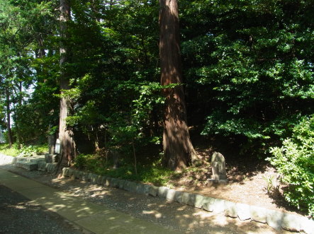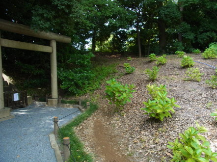 | 本堂北脇の土塁。 右手が膨らんで張出しています。 |