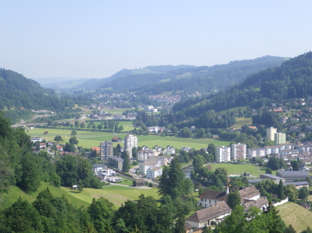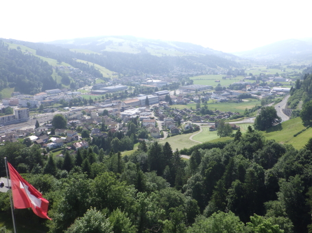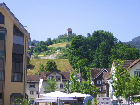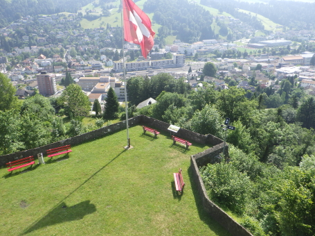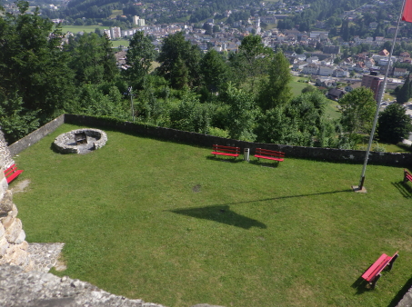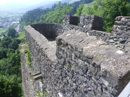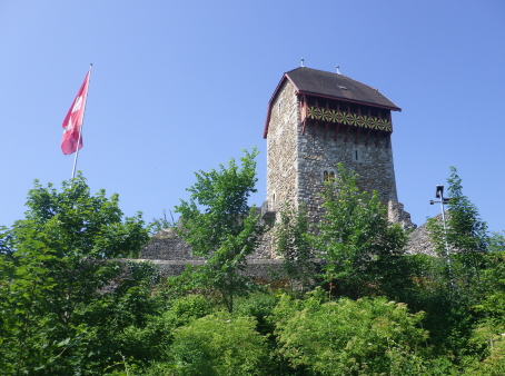 <沿革> 1228年に、ザンクト・ガレン修道院に奉職するイーベルク家が登場しており、1240年ごろ までに、ヴァットヴィル周辺の修道院の所領や財産を監督する目的で築かれたと推測され ている。城名は、Eiben(イチイ)で覆われた丘という意の「アイベンベルク」という耕牧地名 から採られたとみられている。 1249年、イーベルク城はトッゲンブルク伯クラフト1世に攻略された。クラフト1世は城名を 自らにちなんだクラフツベルク城に改めたものの、修道院長ベルヒトルト・フォン・ファルケン シュタインが対の城として1253年にベーレンフェルス城を築くと、1255年にイーベルク城を 奪回した。ベーレンフェルス城については、どこにあったのか今なお明らかでない。 イーベルク城には歴代のザンクト・ガレン修道院長がしばしば滞在したとされる。1288年 にドイツ王ルドルフ1世がコンラート・フォン・グンデルフィンゲンを修道院長に任命すると、 前修道院長のヴィルヘルム・フォン・モーントフォルトが反発して抗争が始まった。1290年、 コンラートはイーベルク城やアルトトッゲンブルク城を攻め落としたが、1291年にルドルフ 1世が薨去すると後ろ盾を失い、失脚して翌1292年に城をヴィルヘルムに返還した。 15世紀初頭、ザンクト・ガレン修道院とアッペンツェル市の争いがアッペンツェル戦争に 発展すると、イーベルク城は1405年にアッペンツェル市らを中心とする「越湖同盟(Bund ob dem See)」によって占領・破壊された。1408年、ブレゲンツの和議で同盟が解散する と、イーベルク城も修道院に返還され、ほどなく再興されたとされる。その後は代官が派遣 され、1420年の文書では、日中は3人、夜は4人の衛士を配置するよう定められている。 18世紀初めごろ、当時の修道院長レオデガー・ビュルギッサーが城下のヴァットヴィルの 住民に道普請を命じたところ、そのほとんどが改革派に転向していたこともあり強い反発を 招いた。1710年に蜂起した住民がイーベルク城を制圧し、1712年にはカトリック対プロテス タントのトッゲンブルク戦争へと発展した。紛争はプロテスタント側の勝利に終わったが、 1718年にバーデンの和約が結ばれ、城は修道院に返還された。しかし、修道院は城館を 廃して家臣に貸し与え、彼らは宿屋を営んだとされる。 1805年に世俗領主権をもつ機構としてのザンクト・ガレン修道院が解体されると、城は 民間に払い下げられた。1835年には、城を救貧院に供するという提案がヴァットヴィル市 に却下されたことに憤慨したヤーコプ・シュヴァンダーという工場主によって、屋根と骨組み がすべて取り払われるという事件が起きた。これによって城の荒廃が一気に加速したが、 個人所有ということから修復はなかなか行われなかった。1901~02年にかけてようやく、 主塔などの建物が修築され、観光施設としての利用が可能になった。直近では、2011年 に大規模な改修工事が実施されている。 <手記> ヴァットヴィルはチューリッヒ湖とザンクト・ガレンの間に延びるトッゲンブルク地方の中心 都市で、その旧市街をトゥール川の対岸に見下ろす丘上にイーベルク城があります。駅裏 から歩いて20分ほどで辿り着くことができ、城内や主塔は無料で公開されています。 南東辺を除く主郭の三方には空堀が巡っていますが、堀切兼通路となっている北東辺を 除く2辺は藪に埋もれています。かつてはぐるっと一周できた感じなのですが、いずくの国も このあたりは同じなんですね。堀切の北東側には削り残しの峰先部があり、副郭として用い られていたのではないかと推察されます。 主塔は居住棟も兼ねていたようですが、薄暗く寒々しく、とても住みたいとは思えません。 最上階の一つ下に懸造状のテラスがあり、トゥール川沿いの景色が楽しめるものの、木製 なのでいささか不安にも感じて長居はできませんでした^^;主塔に付属する高い城壁の上 も歩くことができて、こちらもなかなかスリリングです笑 それにしても、ザンクト・ガレン修道院という強権者の持ち城だったためか、15世紀の初め から18世紀初頭までの約300年に亘り、戦闘も抵当も経験していない平穏な歴史を歩んで きたというのは興味深いように思います。 |