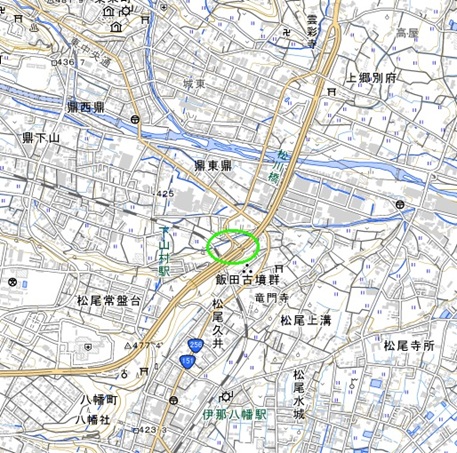 <沿革> 上の城の地名があるが、詳細は不明である。 <手記> 松川の河岸段丘が舌状に削られた部分を利用した城です。城域内を飯田バイパスが 縦走しており、遺構はほぼ消滅しているようです。ランプ脇にその名も「上の城墓地」が あり、私が歩いた限り城跡について直接示した唯一のものでした。 墓地の西側を飯田線の線路が切通し状に横断していて、あるいは堀切跡を利用した とも考えられますが、確証はありません。また、周囲は飯田古墳群としていくつもの古墳 が散在しているようで、線路西側には御射山獅子塚古墳の立派な墳丘が残っています が、城跡と関係があるのかは不明です。さらに、南西4kmほどの三日市場には下の城が あったとされていますが、こちらとも対なのかどうか分かりません。 城跡の歩道橋からは正面に飯田城跡や愛宕城跡が望め、これだけでも訪れる価値 はあるといえます。私が訪れたとき、例によってちょうど列車が走っていきました。 |
