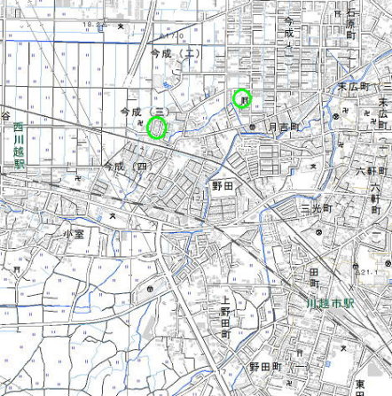 <沿革> 『日本城郭大系』によれば、北条新九郎の子孫とされる川田備前守今成がこの地に 住し、開拓したと伝わるとある。新九郎は後北条氏代々の当主が用いた通称であり、 具体的に誰を指すのか定かでない。比定地の1つである熊野神社の縁起によれば、 今成は永禄年間(1558〜70)にこの地に入植し、天正元年(1573)に神社を勧請した とされる。これが正しければ、今成は伊勢長氏(北条早雲)ないし北条氏綱の縁者で あると推測される。 他方、永禄二年(1559)成立の『小田原衆所領役帳』によれば、河越衆宇野源十郎 が今成に200貫465文を知行しているとある。宇野氏は室町時代に中国から渡来し、 ういろう製造(この「ういろう」はお菓子ではなく丸薬)を始めた陳外郎の子孫で、京都 外郎家の分家小田原外郎家に端を発する。源十郎は小田原外郎家の祖宇野定治の 子家治と同一とされる。 永禄二年時点で今成の地名がすでにあったことは確実であり、そのころの領主は 宇野氏であったことから、川田今成が実在したか否かは別として熊野神社の創建者 や永禄年間以降の今成屋敷の主は宇野氏であった可能性が高いように思われる。 <手記> 今成屋敷の比定地には2つあるようです。1つは前出の熊野神社、もう1つは安楽寺 東側門前です。両者に共通しているのは、どちらも水路に囲まれた長方形の区画で あるという点です。これらの水路はおそらく、開拓当時湿地帯であった周辺の水位を 下げるために掘られたものでしょう。 したがって、どちらが有力かといわれてもなかなか判断しにくいところではあります。 ただし、熊野神社の東辺には水路になっていない浅い堀跡が認められます。これは 神社や開拓に必要な造作とは思えないので、あるいは屋敷の遺構といえるかもしれ ません。 ちなみに、川田今成が実在したとして、北条氏当主の子孫であるというのはにわか には信じられません。少なくとも、男系の子孫である可能性は低いでしょう。せいぜい、 北条一族の誰かと縁戚関係にあったというところではないかと拝察されます。 |
