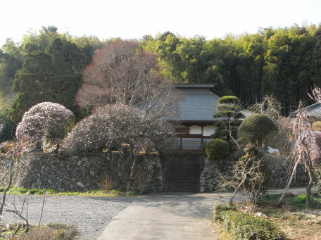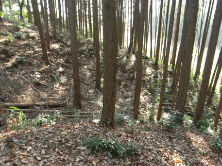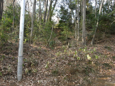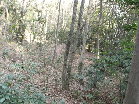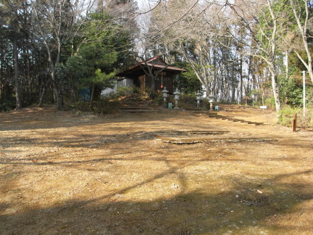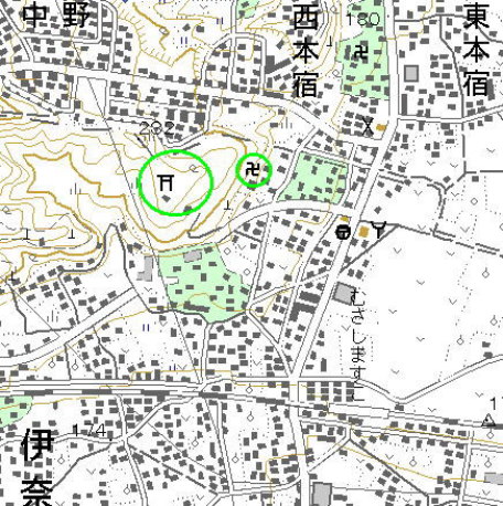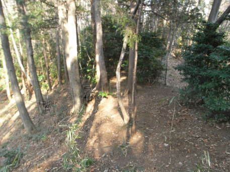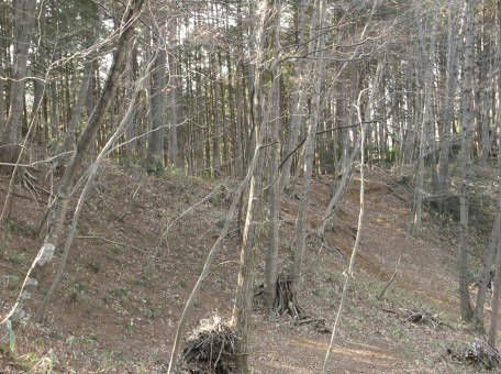<沿革> 『新編武蔵国風土記稿』では宗剣寺を館跡とし、同寺の開基が平井某と伝わっていることから、 平井氏の館であると推測している。宗剣寺は山名を平井山とするが、現在では松岩寺と改名して いる。 平井氏については後北条氏の家臣とみられているが、その詳細は明らかでない。「平井郷伝馬 奉行」や「平井半兵衛」に宛てた書状が伝わっており、平井宿が後北条氏にとって重要な宿駅の 1つであったことがうかがえる。ただし、平井半兵衛が平井家当主あるいは伊奈城主であったかに ついては明らかでない。 『記稿』や『日本城郭大系』では松岩寺一帯のみを平井氏の館として扱っているが、松岩寺背後 の丘上にも城郭遺構が見受けられることを、田中祥彦氏や中田正光氏、菊池忠氏らが突き止めた とされる。伊奈城という呼称は、3氏によって命名されたものである。 <手記> 伊奈城は、南北方向の街道を見下ろす小丘にあります。その東裾の松岩寺は、周囲を2mほどの 石垣で囲われ、ここに館があったことは容易に想像できます。後背の丘へは、寺の南側から登り道 があります。途中に配水場があり、ここまでは車道があります。山頂には比郷神社があり、車道の 脇にはもともと神社への参道だったと思われる尾根道の跡が見られます。おそらくは、登城路でも あったのでしょう。 山頂の比郷神社周辺が主郭と思われますが、削平が完全ではなく、南東へ緩斜面の続く原地形 に近い空間となっています。田中氏はこれを防御上の工夫とみていますが、私は削平の必要性を 感じなかった、あるいは時間がなかったといったやむを得ぬ事情によるものではないかと思います。 このような緩斜面の曲輪をもつ城としては、同じく後北条氏が築いた山中城があります。 主郭の北東および北西側が峰続きとなっており、どちらも尾根筋は土橋状に削られているように 見受けられます。北西尾根下には、腰曲輪と思われる平坦地があります。さらに、主郭の西と南西 に竪堀跡が見てとれます。南西の竪堀はやや不明瞭ですが、西のそれは規模も大きくはっきりと 残っています。 このように、平井氏館背後の丘に城郭が営まれていたことは間違いないと思われます。この城に ついて、田中氏は『多摩丘陵の古城址』のなかで、西の武田氏の侵攻に備え、網代城と呼応して 防御ラインを布くためのものと推測しています。たしかに、永禄十二年(1569)に甲相同盟が破綻し て武田信玄が侵攻したとき、氏照は塩山から青梅街道を通り檜原へ抜ける侵入ルートを想定して いたといわれます。このルートを押さえるために網代城-伊奈城ラインを急遽設置した可能性はある かもしれません。ただ、網代城は北条氏が拠点として重視するには少々山奥すぎる感があり、なお かつ伊奈城も網代城も十分に籠城兵を駐屯させられるだけのスペースも設備もありません。網代城 が伝えの城もしくは狼煙用の城と考えられているのと同様、伊奈城がそれほど大きな役割を負って いたのかについては疑問です。 個人的には、眼前の平井宿が南北・東西両方面の街道が交わる要衝にあることから、この宿駅 を監視するためという至極一般的な役割をもった城だったのではないかと思っています。また、単郭 を基調とした簡素な城であるということや、さほど要害の地ではないことから、在地領主の館の付属 施設とみるのが妥当ではないでしょうか。ともすると、後北条氏以前、武州南一揆の頃に端を発する ものとも考えられますが、今のところすべては推測の域を出ません。 |