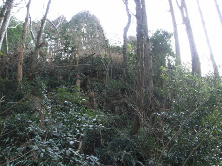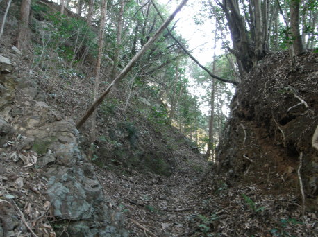 <沿革> 土佐の国人秦泉寺氏の居城である。秦泉寺氏の出自については、一族の吉松氏が清和源氏の後裔と 称しているが、詳細は不明である。 戦国時代、秦泉寺掃部茂景ははじめ本山氏に属していた。東から長宗我部国親が勢力を拡大すると、 茂景は近隣の大高坂氏や国沢氏の援助を受け、国親に抵抗した。弘治二年(1556)、国親は秦泉寺城 攻略の軍を起こし、茂景はついに降伏した。 茂景の子豊後守秦惟は、永禄三年(1560)の長浜戸の本の戦いにおいて、初陣の元親に槍の使い方 を指南したとして知られている。 いつごろか不明だが、秦泉寺父子は万々城へ移され、秦泉寺城には中島親吉が入った。後に、秦泉寺 父子は、元親の命を受けた親吉によって誅殺された。周辺領民との領境争いが原因とも、元親への謀反 を企てたためともいわれるが、その理由は定かでない。 その後の秦泉寺城については不明である。 <手記> 秦泉寺城は、高知市街北隣の山脈の一支峰を利用した城です。支峰といっても、東西は切り立った崖 となっており、また南北は峰続きではありますが、ほとんど半独立した山といえます。 現在、西隣して旧土佐山村への幹線道路が走っています。城の南端付近に、落石防止用のフェンスが 切れて階段が設けられていて、ここから登ることができます。城跡一帯は果樹の畑となっているようです が、道はあってないような感じになっています。曲輪は判別しにくいのですが、随所に堀切や竪堀が見ら れます。 |