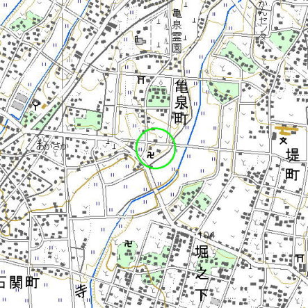 <沿革> 柳沢氏の城とされるが、柳沢氏や亀泉城の歴史について詳細は不明である。 <手記> 亀泉城は寺尺川に沿って伸びた舌状の丘陵に築かれた城です。古絵図によれば、 主郭は北東に鬼門の折れをもったほぼ方形の曲輪で、その南北に堀切を穿っていた とされています。本丸は現在公民館となっていますが、遺構は消滅しています。本丸 南の堀切の南側が舌状台地のピークとなっているという少々奇妙な縄張りをしており、 この丘の頂部には如意寺があります。 如意寺境内は物見の曲輪ないし詰曲輪だったものと思われ、さらに一段高いところ にある地蔵堂は烽火台ないし櫓台だったのではないかと推測されます。 如意寺の伝承によれば、戦国時代、周辺は矢内庄太夫なる人物の所領であったと されています。矢内庄太夫について詳細は不明ですが、金山城主由良氏の四天王と 称される重臣の1つに矢内氏があります。この矢内氏との関連も指摘できると思われ ますが、確かなことはいえません。また、矢内氏は「柳井」とも表記したとされ(他にも 「野内」とも)、あるいはこの「柳井」が「柳沢」と誤って伝わったものとも推測されます。 |