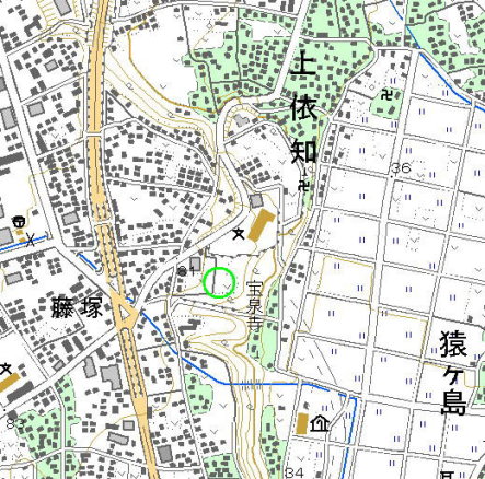 <沿革> 『新編武蔵国風土記稿』では、瑠璃寺の背後の山上に居住していた人物として、「依智小太郎某」の名を 挙げている。『上依知村誌略』には、依知郷領主本間重連の一族として依知直重の名がある。本間氏館跡 に建つ妙伝寺の寺伝には、重連の弟として三郎左衛門直重が登場する。さらに、本間氏一族ではなく郎等 として、越智三郎左衛門直重の名がみられる文献もある。 このように、依智氏あるいは越智氏についてはかなりの混乱がみられ詳細は不明だが、直重の父が萩原 道人入道道珍という名であることは共通している。そして、字「城山」のすぐ北側、上依知小学校のあたりに は、「道珍」という字名が残っている。 総じて今のところ、本間氏の一族かそれに準ずる依智氏ないし越智氏が、城館を構えた可能性が指摘 できるにとどまっている。『日本城郭大系』では、後北条氏時代に依知郷の西の散田郷を領していた越智 弾正忠と、上依知の越智氏との関連を示唆している。 <手記> 上依知城山は、相模川の峻険な河岸段丘の一角を指す字名です。東は崖で、南には深い谷が入り込んで います。要害性といえばその程度で、現在一帯は畑地となっており、遺構も認められません。 ただ、眼前が八王子道と大山道の追分となっており、交通の要衝を扼するための崖端の城館と考えると、 何らかの施設があったことは十分に推測できます。 |