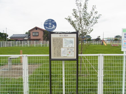 | 城址公園と説明板。 左手水飲み場脇にあるのが堀跡を示す柱。 |