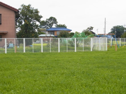 | フェンスの手前に堀幅を示す2本の柱。 |