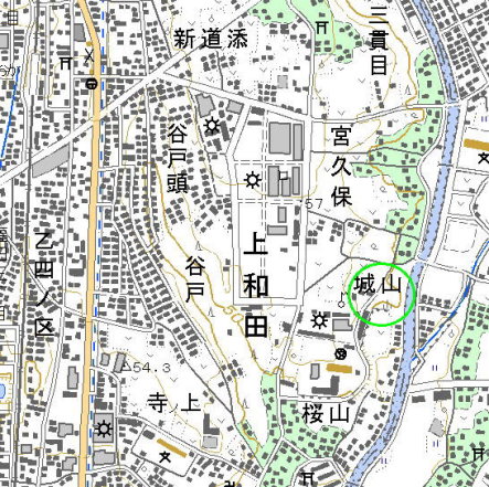 <沿革> 上和田字城山について、『新編相模国風土記稿』に「三十間四方、塁跡の高さ一丈ほどあり、 堀の状存す」とある。また、土塁状の高まりを指す「土合(どえー)」という小字もある。 和田判官あるいは和田義盛の館跡とする土地の口伝があるが、確かなことは不明である。 <手記> 城山は、境川河岸が一部せり出し、三方が崖となったところにあります。『記稿』にあるような 塁や堀の跡はすでになく、確たる遺構らしきものは見られません。北側の谷を上和田2号橋へ 下る道は堀底道のようになっていますが、これが遺構かどうかは判別できません。 山上の道沿いには、城跡由来とみられる小字「土合」について記した石碑が建てられていて、 これが上和田城山に関する唯一の示標です。 和田義盛の館とするのは、地名からの類推に過ぎないように思われます。当時はおそらく 城山の北に東西方向の街道が、そして西には鎌倉古道が南北に走っていたと推測されます。 上和田城山は、こうした交通の要衝を押さえる在郷領主の館であったのではないかと考えられ ます。 |
