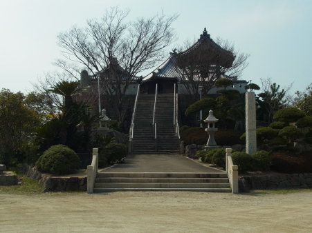 <沿革> 文禄四年(1595)、淡路志知城主加藤嘉明は、文禄の役での戦功により伊予国 松前城6万石に加増転封となった。志知は太閤直轄領となり、はじめ三宅丹波守 が、次いで播磨龍野城主石川紀伊守光元が代官として派遣された。 慶長五年(1600)、光元は志知城に替わって三原川河口に叶堂城を築き、淡路 水軍の拠点とした。しかし、同年中に関ヶ原の戦いが勃発。光元は西軍に属して 改易され、叶堂城も廃城となった。 <手記> 三原川が大日川と合流し、海に注がんとする河口部に築かれています。おそらく 当時は水軍拠点らしく、ほとんど海水に面していたものと推測されます。 感応寺境内が主郭部とされ、本堂は周辺から見ると異様なほどの高台に建って います。明らかに盛り土された地形ですが、これが城の造作の転用なのかどうか は判じかねます。 駐車場入り口には、城跡の石材を現代の穴太衆の技をもって積み直したという 石垣があります。櫓台にもならないほど小さく、往時の石垣の「復元」とはとうてい 思えませんが、石材が城のものというなら十分貴重な遺構といえるでしょう。 また、寺の周囲には堀跡のように見える窪地の田や水路が見受けられます。 とくに東側の低い田は、航空写真で見ると城の堀跡をそのまま利用しているように 見えます。とすると、わずか数か月しか存在しなかった城としては、感応寺境内は わりと本丸の外形を残しているのではないかと思うのです。 |