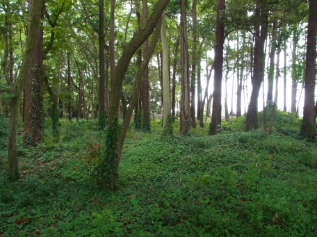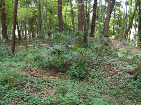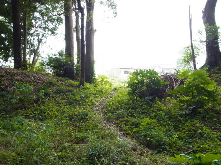 <沿革> 残存する遺構の状況や、敷地内に「馬場」の小字が残り、城山南東隅の旧家に「根小屋」 の屋号が伝わることなどから、中世城館跡とみられている。ただし、史料や伝承にはみられ ない城跡である。 現在のところ、鎌倉時代後期に相馬氏によって築かれたとする推定がなされている。とく に、幸谷城の北500mほどのところにある増尾城と同じく、相馬胤村の庶子師胤を築城主と する説が唱えられている。これは、胤村死後に師胤が胤村嫡男の胤氏と家督を争って敗れ、 師胤の母で胤村後妻の阿連尼に増尾村の継承が認められる形で幕府の裁定がなされた ことに依拠するものである。ただし、確証はなく、推測の域を出るものではない。 <手記> 幸谷城は、南から西へ大津川の支脈が細く入り込む台地の角に位置しています。現在は 宅地となっている北側にもかつては谷戸が切れ込んでいたそうで、もともとはコブ状にせり だした地形になっていたものと推測されます。お隣の松戸市にも同名の幸谷城があったと され、区別するために増尾幸谷城と呼ばれることもあるようです。 地元できつね山と呼ばれる城跡はほぼ全域が私有地なのですが、里山保存や緑化推進 などを目的とした柏市の「カシニワ制度」に登録されていて、一般に公開されているとともに、 市民団体によって定期的な手入れがなされています。 とはいえ、城内への入口は2ヶ所あるのですが、北側のそれは表札の掲げられた私邸の 入り口を抜けなければならず、西麓側の方は道が細くて分かりにくく(車からではおそらく 見つけられないでしょう)、『大和之古城』のダイさんとご一緒に歩いて偶然見つけられたと いったところです。 城は、東西方向に長方形の、土塁と堀に囲まれた簡素な縄張りをしています。北と南に それぞれ1つずつ曲輪が並んでいた可能性が指摘されているようですが、構造的に現下の 曲輪が主郭とみて間違いなさそうです。 土塁はそれほど高いものではなく、堀も小規模なもので、城というより居館に分類される ものと思われます。増尾城と比較して明らかに古めかしいつくりをしており、相馬氏が鎌倉 時代に拠ったものとするなら、増尾城ではなくこちらの方ではないかと感じさせます。 主郭から北東に少し離れたところに、物見台と呼ばれる独立した小丘があります。主郭 の北にもうひとつ曲輪があったとすれば、この物見台がその北東隅にあたると考えられて います。 ちなみに、私たちが訪れた第二土曜日は奇しくも月に一度の定期手入れの日だそうで、 市民団体の方にお話をうかがうことができました。軍手ひとつ持参すれば、誰でも手入れ には参加できるそうですので、たまには訪れるだけではなくて城跡を整備する側に回るの もいいな〜と感じました。自宅の近くであれば、の話ですが^^; |