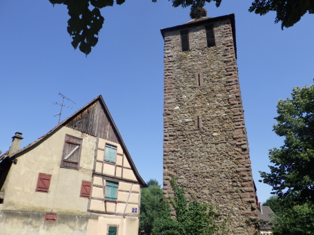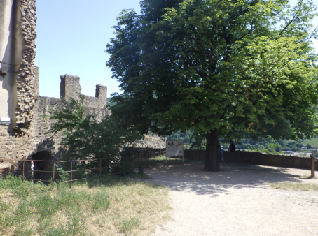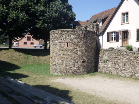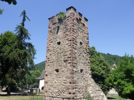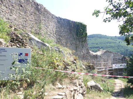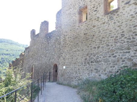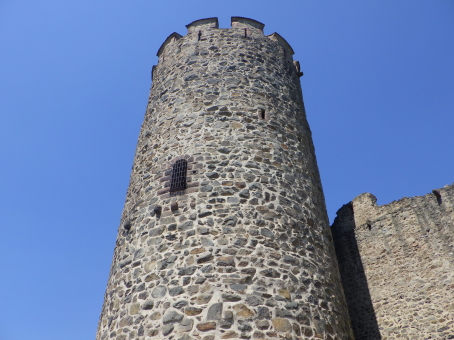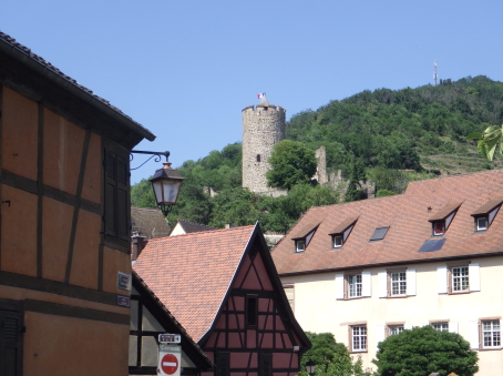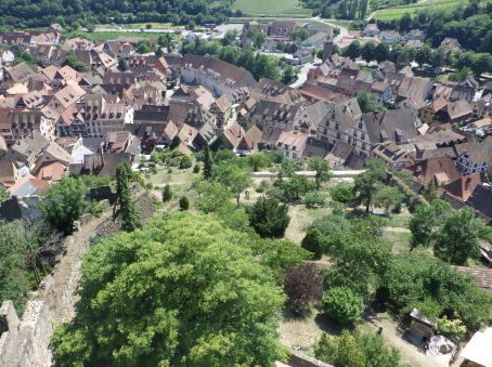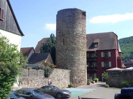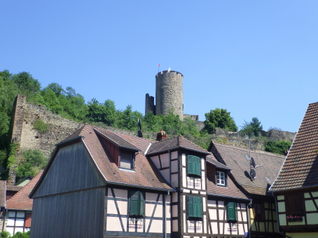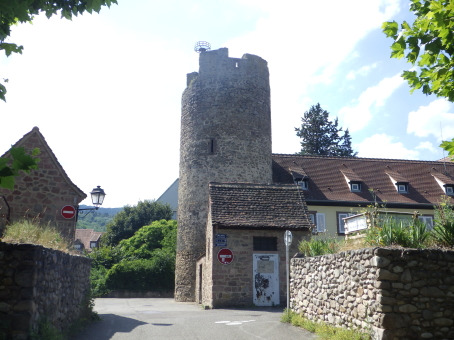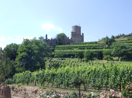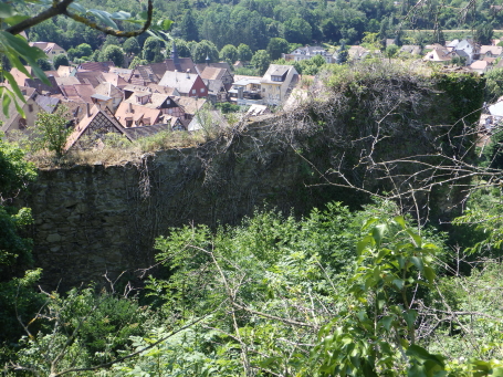 <沿革> 1227年、皇帝フリードリヒ2世の嫡子であるハインリヒ(7世)が、コンラート・フォン・ホルブルクと アンセルム・フォン・ラッポルトシュタインから銀250マルクという高額でカイザースベルクの土地を 購入したとするのが史料上の初出とされる。当時、丘には帝国の直臣アルビン・ヴェルフェリンが 土地の所有者でないにも関わらず勝手に築いた城が建設中であったか、完成して間もない状態 であったと考えられている。ハインリヒはコルマールからディードルスハウゼン(現在のル・ボノム) の峠を越えてロートリンゲン(ロレーヌ)へ通じる街道の掌握を急いでいたとみられている。 城は皇帝の丘を意味するカイザースベルク城と名付けられた。麓には、町の前身となる40人の 騎士を収容できる根古屋も建設された。しかし、ハインリヒはドイツ王であったが父とは不仲で、 1234年に反乱を起こしたものの諸侯が同調せず、降伏して幽閉された後、1242年に護送される 途中で転落死した。そのためハインリヒ自身は皇帝には即位していない。 フリードリヒ2世はローマ教皇と断続的に対立を続けており、1246年にはストラスブール司教 ハインリヒ3世・フォン・シュターレックがカイザースベルクを包囲した。翌1247年になっても陥落 しなかったが、破門の脅迫を受けてついに開城した。翌年には、同じ教皇派のロートリンゲン公 マトイス2世が城と町を占領している。1253年、カイザースベルクはにホラント伯ウィレム2世に 引き渡された。 ウィレム2世はフリードリヒ2世の次男である皇帝コンラート4世の対立王であったが、コンラート 4世が1254年に没すると、唯一のローマ王となった。しかし、1256年に遠征の帰路で溺死すると、 ローマ王のいない大空位時代に突入する。王権が弱まったことを受けて、ストラスブール司教と ストラスブール市の間でカイザースベルクを巡る争いが生じ、1261年に司教ヴァルター・フォン・ ゲロルトゼックが手中に収めた。だが、同年中にルドルフ・フォン・ハプスブルクが城を占領し、 ルドルフが1273年にドイツ王となると、カイザースベルクは再びカイザー(皇帝)の手に戻った。 この間、ルドルフは城を総石造に改修したとされる。 1293年、カイザースベルクは帝国自由都市に昇格した。1330年、皇帝ルートヴィヒ4世は城と 町をボヘミア王ヨハン・フォン・ルクセンブルクの抵当に入れたが、1336年にハプスブルク家の 意を受けた在地代官がカイザースベルク城を包囲し、奪い返した。城は14世紀中に何度か拡張 されている。 百年戦争末期の1444年、カイザースベルク城はアルマニャック派の猛攻に晒されたが、耐え 抜いた。しかし、城は大きく荒廃し、下の城と呼ばれる下方の曲輪群は15世紀中に放棄された と考えられている。それまで、主郭部へは下の城(ウンターブルク)からしか入れなかったが、 主郭東辺に新たな城門が設けられた。 1525年の農民戦争に際してカイザースベルク城も反乱軍に攻められ、数時間の砲撃の後に 降伏した。1583年には近代戦に対応できるよう要塞化され、三十年戦争中の1635年と1636年 に包囲されたものの、やはり持ち堪えている。しかし、城砦は大きく破壊され、1648年にヴェスト ファーレン条約が締結されたころには廃墟と化していた。城跡はフランスの手に渡ったものの、 国王ルイ14世は再建を拒否したとされる。 1796年、城跡はフランス革命を経てフランツ・ヨーゼフ・ベックリン・フォン・ベックリンザウに 売却された。フランツは主塔を除く建物を撤去し、部分的に爆破してブドウ園を開いた。19世紀 中葉にアルザス歴史建造物保存協会へ管理が委託され、現在は2016年に合併して誕生した 新コミューン「ケゼルスベール=ヴィニョーブル」の所有となっている。 <手記> ケゼルスベールはコルマール北西の、ワイス川が平野部に出る喉口部に位置する小さな町 です。フランス語ではケゼルスベールと読みますが、上述の通り由来はドイツ語のカイザース ベルクで、当時もそのように呼ばれていたはずなので、記事内ではそちらを採用しました。 綺麗に修復・保存されている主塔がシンボリックで、屋上まで無料で登れます。もちろん眺め は素晴らしく、アルザスワインのブドウ畑が一面に広がる風景が楽しめます。主郭の尾根先は 数段のウンターブルクが続いていますが、上記の通りブドウ畑として爆破・開削されているうえ 今のところ立ち入りはできないようです。また埋められたのか堀が一切見られず、城跡としては いささか残念な保存状態のように思えました。 その代わりというわけでもないでしょうが、麓の旧市街には城塔や城壁、堀跡などが散在して います。町自体も中近世の趣が色濃く残っていて、ワイナリーや宿泊施設も少なくないようで、 私としては穴場の観光スポットとしてコルマールと合わせて訪れて損はないと思います。また、 後で調べて知ったのですが、ケゼルスベールはかのシュヴァイツァー博士の生地だそうです。 |