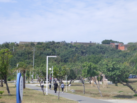 | 旗津の浜から旗後砲台を望む。 右手に城門が見えます。 |
