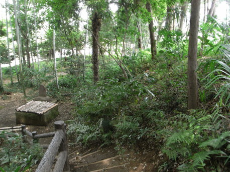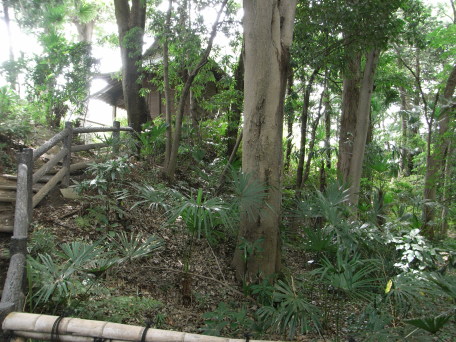 | 弁慶覗の井戸(左)と土塁状遺構。 | |