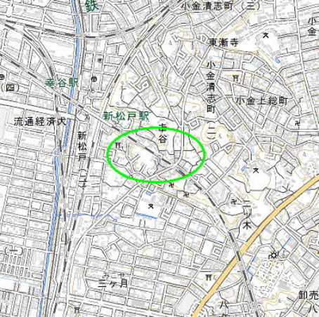 <沿革> 『高城家文書』によれば、享保十三年(1728)に小金城主高城氏の子孫である旗本高城 清胤のもとを幸谷の五郎右衛門なる人物が訪ね、自分の先祖は高城氏家老斎藤外記で あり、斎藤家の城が幸谷にあったと語ったとある。 斎藤外記や斎藤氏について、詳細は不明である。 <手記> 赤城神社から通称「関さんの森」の間の何処かに、幸谷城はあったとされています。坂川 河岸の城館と推測されますが、武蔵野線の土取りによって旧地形はほとんど崩されている ようです。 『日本城郭大系』には堀と土塁が現存しているとありますが、どこにあるのか、まだ残って いるのかは不明です。赤城神社の入口に、削り残しにしては不自然な塚状の土盛りがあり ますが、あるいはこれが土塁跡かとも思われます。 旧地形図に照らしてみると、赤城神社は東から西に延びる舌状台地からさらに飛び出した、 浮島のようなところにあります。ですので、神社境内か、もう1つ台地の根本側(現在は線路 の下)に比定することは十分可能かと考えられます。 |